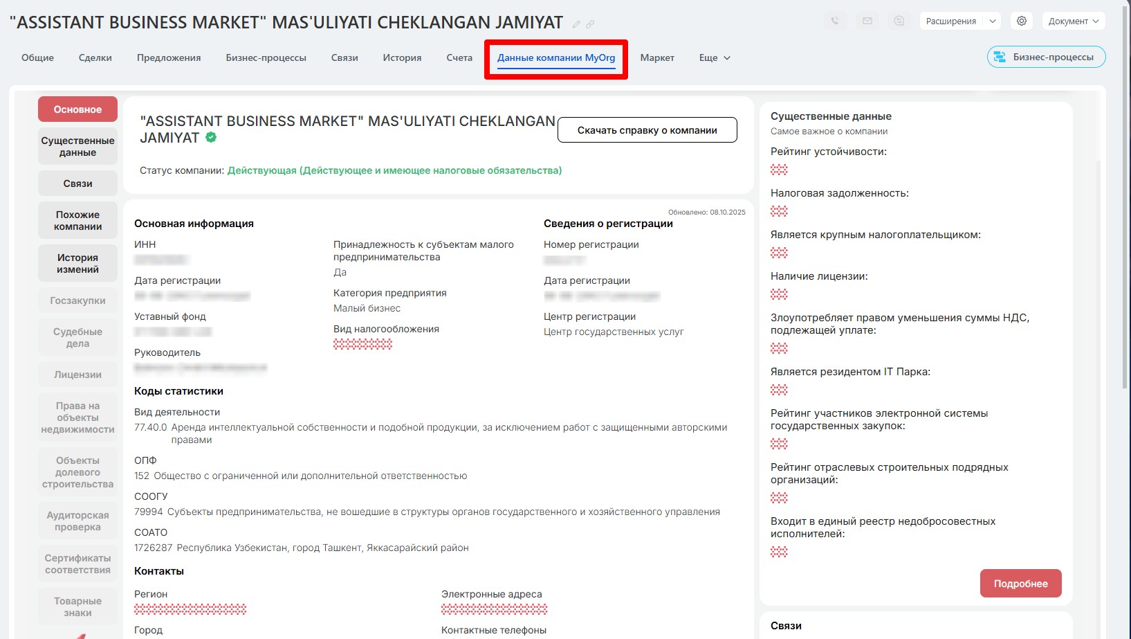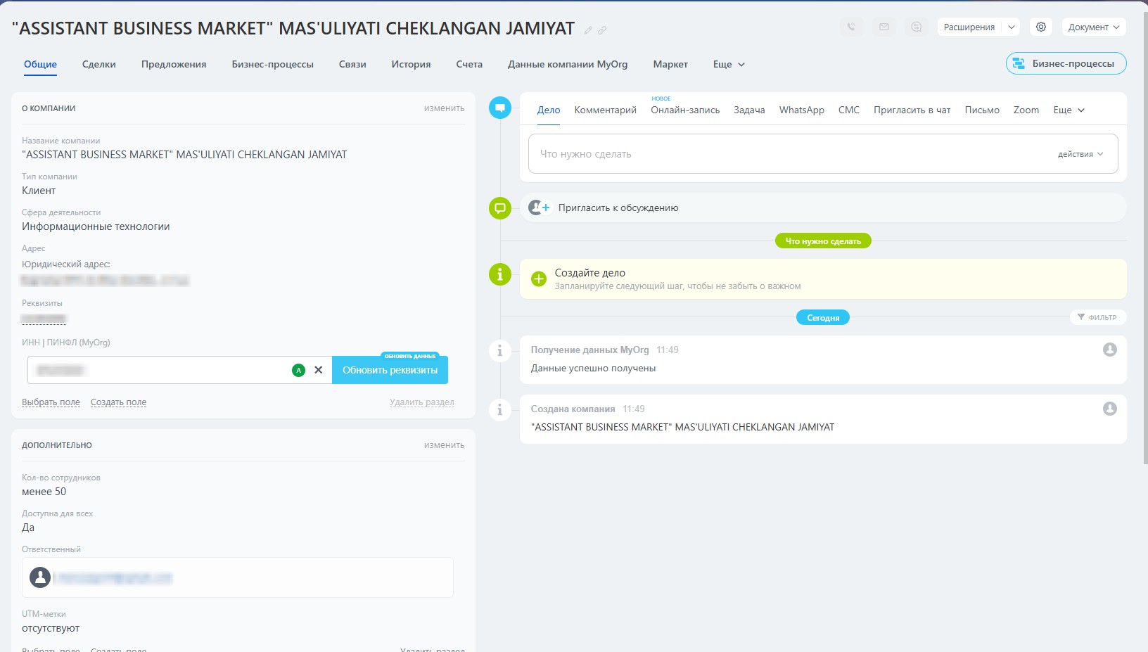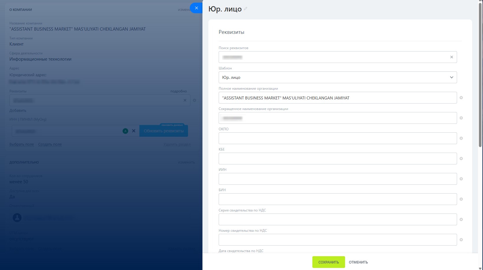 5. Кнопка обновить реквизиты станет активной после сохранения карточки