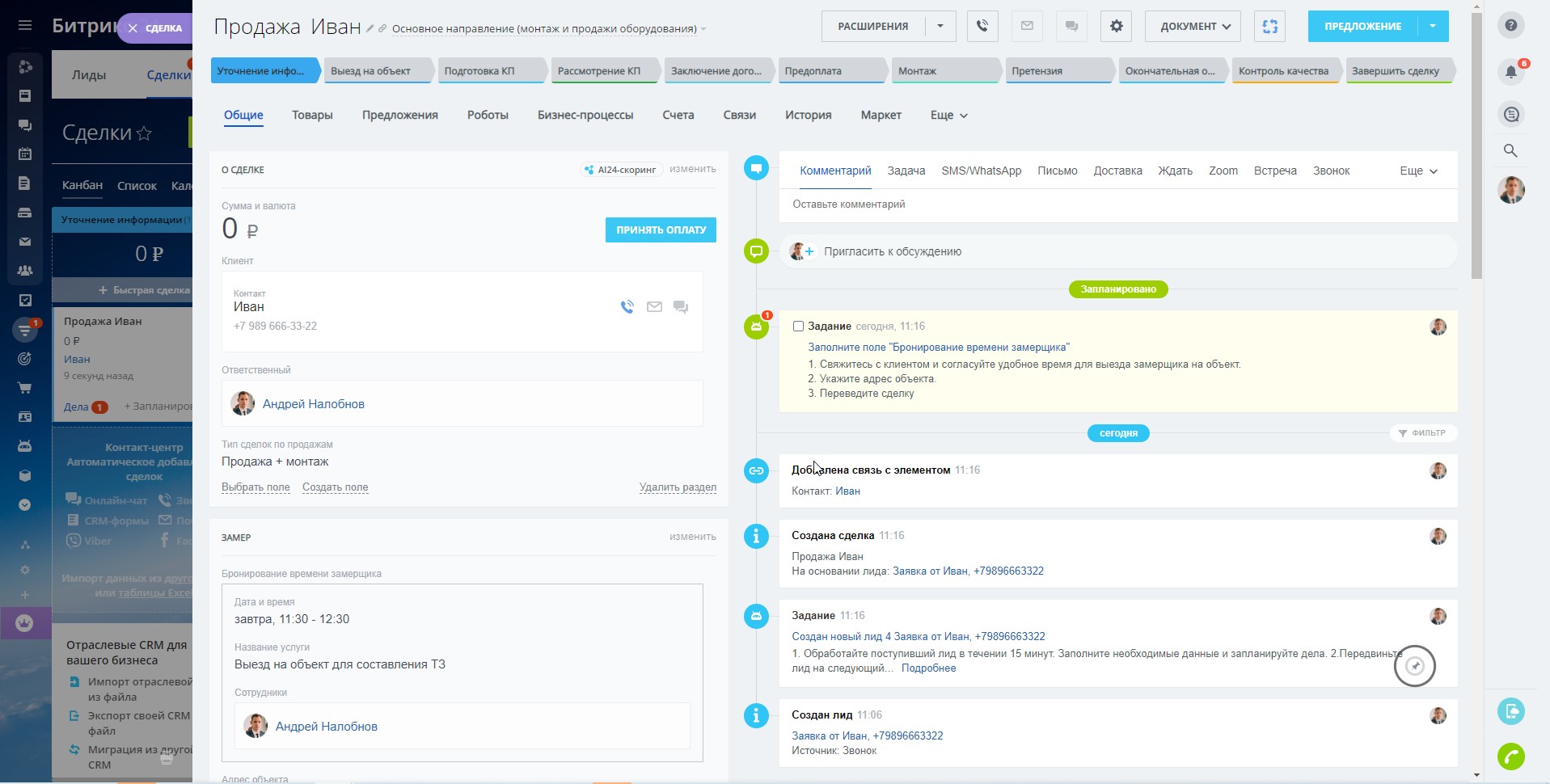 Если сумма предоплаты указана "0", сделка автоматически перейдет на стадию "Монтаж", иначе - сделка останется на этой стадии. Менеджер получит задание о выставлении счета на предоплату и подтверждения его оплаты.