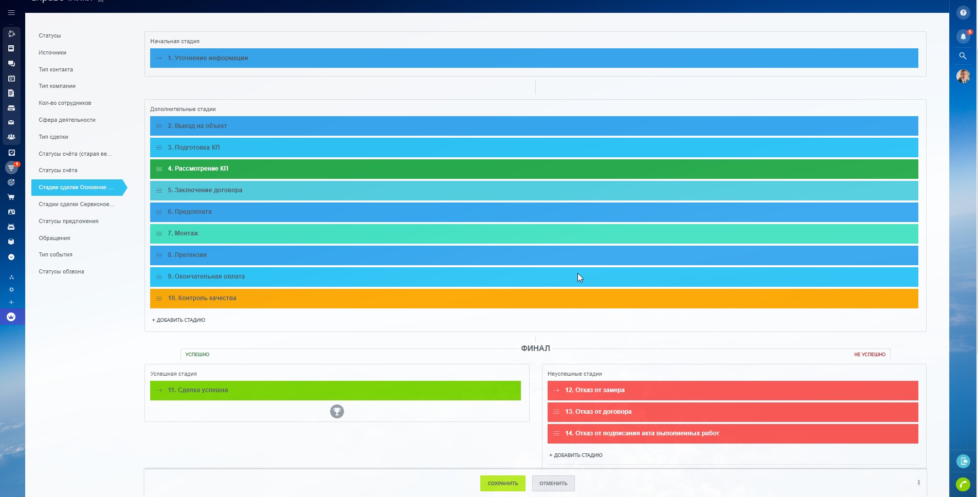 Воронка "Основное направление (монтаж и продажи оборудования)" включает в себя стадии: