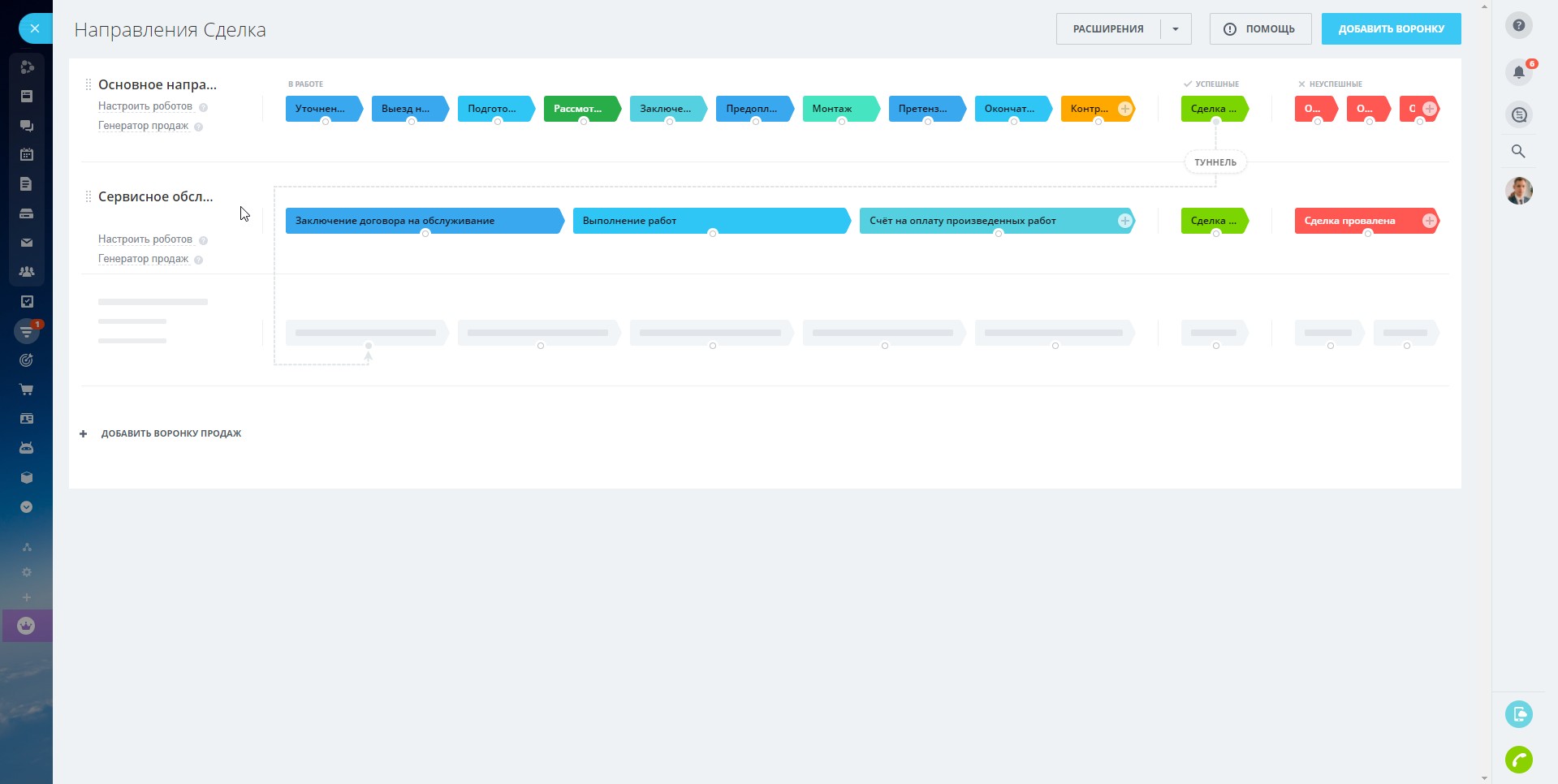 Также на этой стадии настроен туннель продаж, который создаст сделку в воронке "Сервисное обслуживание".