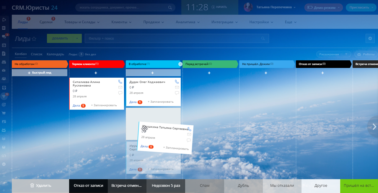 Для удобства работы настроен справочник Тип сделки: пакет документов, пакет документов с выездом, пакет документов с представительством в суде, допродажа и созданы пользовательские поля: Описание проблемы, Ценовая категория, Отрасль права, Юрист первичного приёма, Номер договора, Дата договора, ТЗ, Согласователь ТЗ, исполнитель, ПД, Согласователь ПД, Ответственный за выдачу, Выездник, судебный представитель, Акты, Причина отказа клиентом, Причина отказа нами и другие необходимые поля.