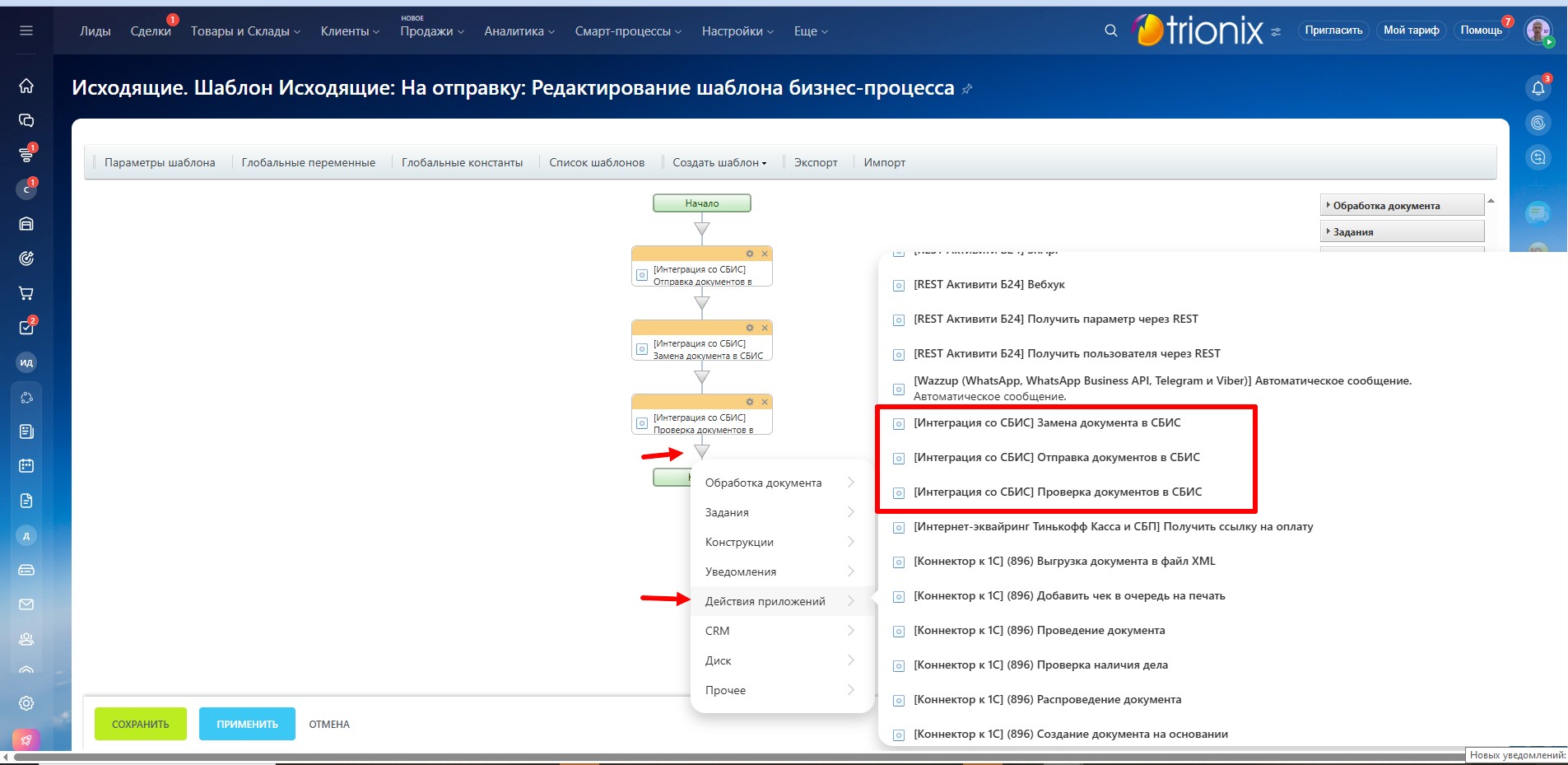 После установки приложения в настройках бизнес-процесса появятся три новых активити в разделе Действия приложений: