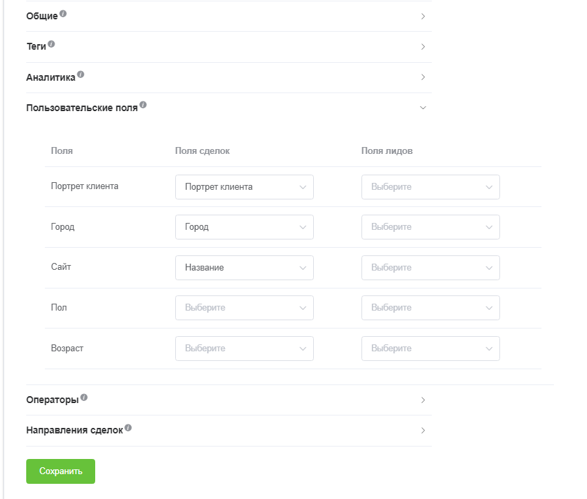 Приложение позволяет получать данные из систем аналитики и записывать в поля сущностей CRM: url, utm, yandex_id, google_id, comagic_id, roistat_visit.