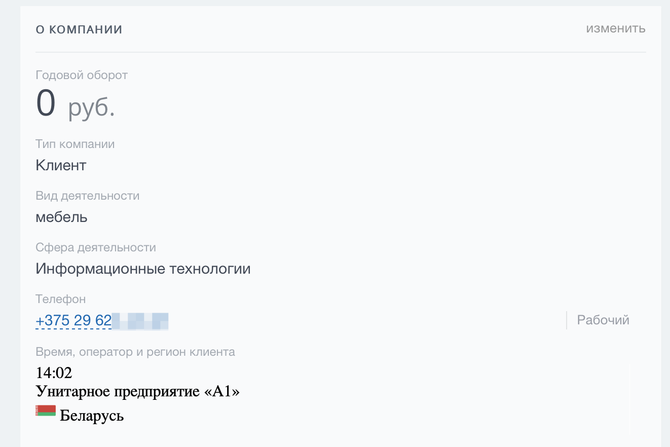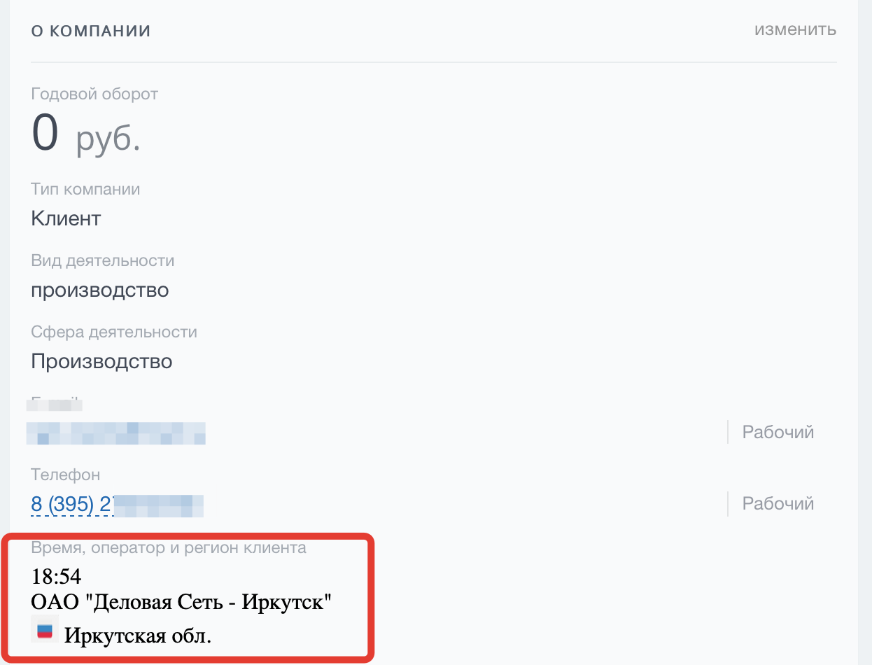 Информация отображается в карточке лида, сделки, компании, а также контакта. Дополнительно приложение определяет время и регион во всплывающем окне при входящем звонке в Битрикс 24.