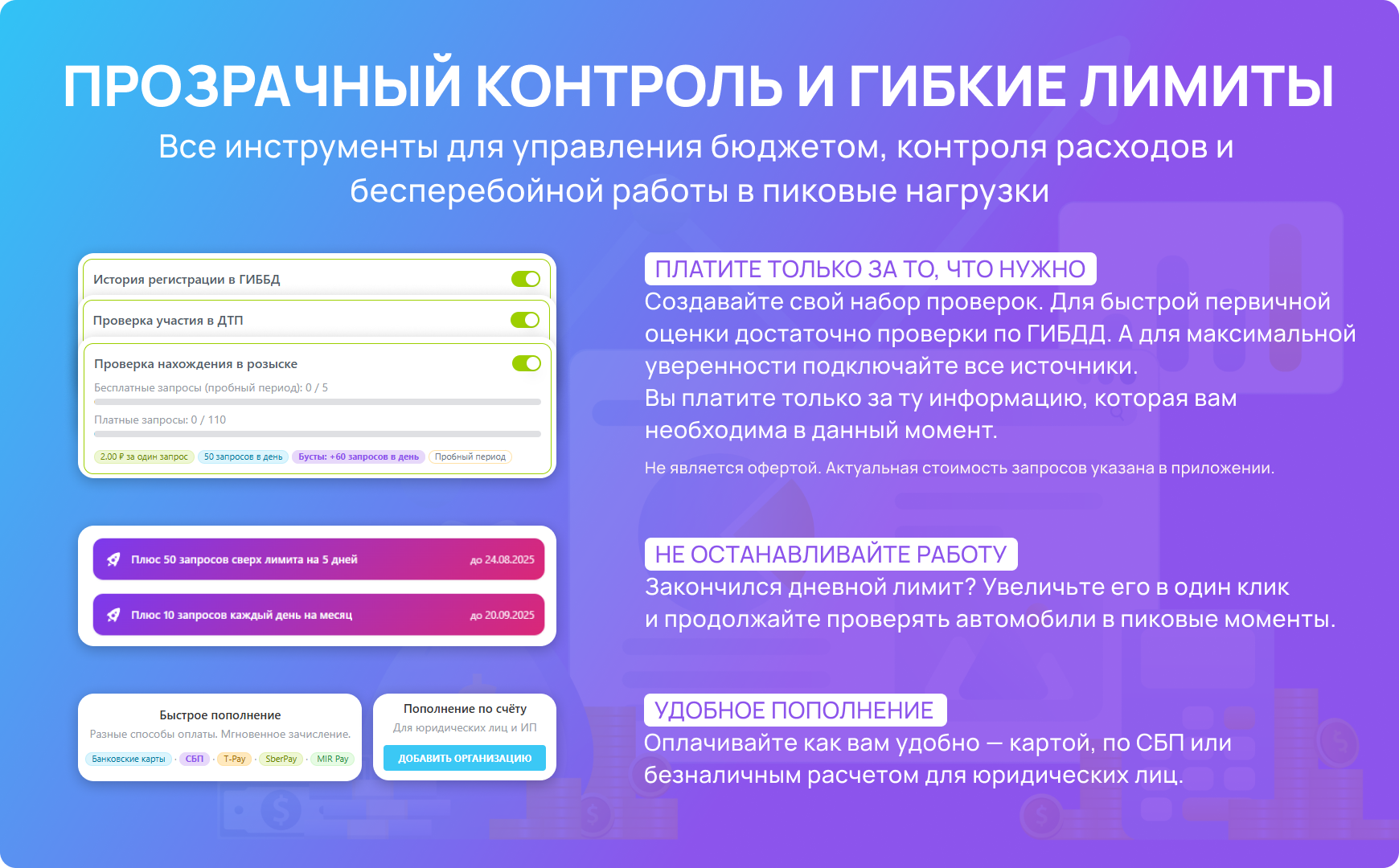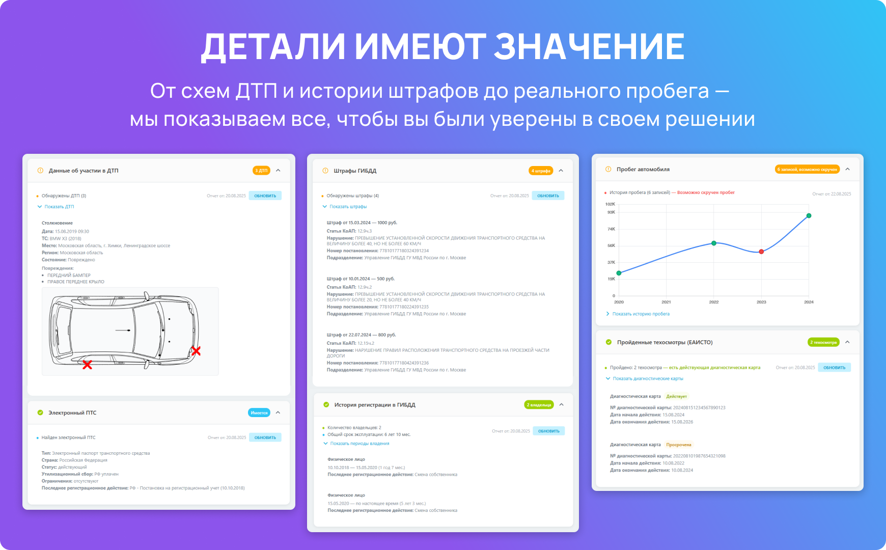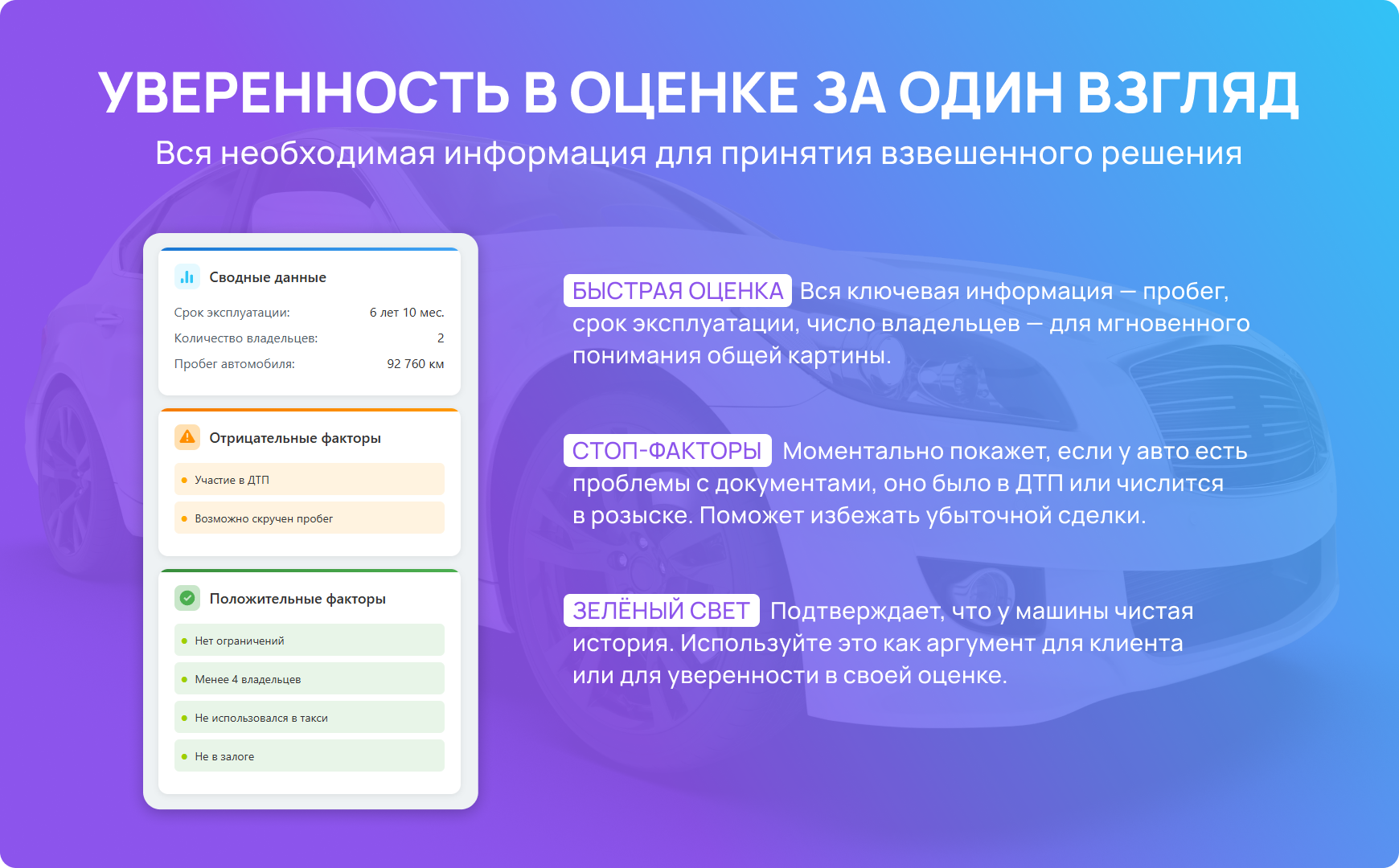 - Моментальная оценка рисков: За секунды выявляйте юридические проблемы, участие в ДТП, скрученный пробег, работу в такси и другие критические факторы.