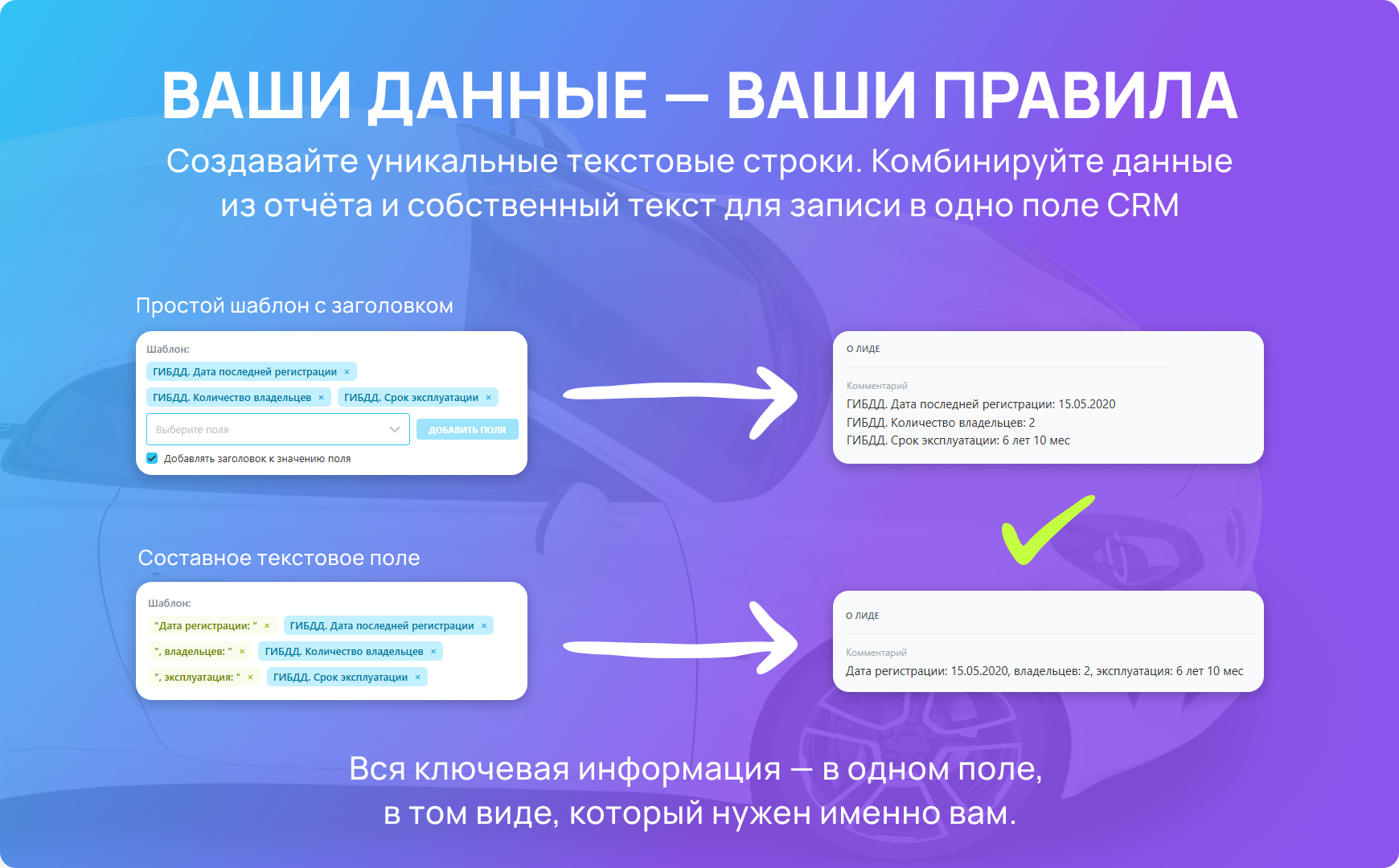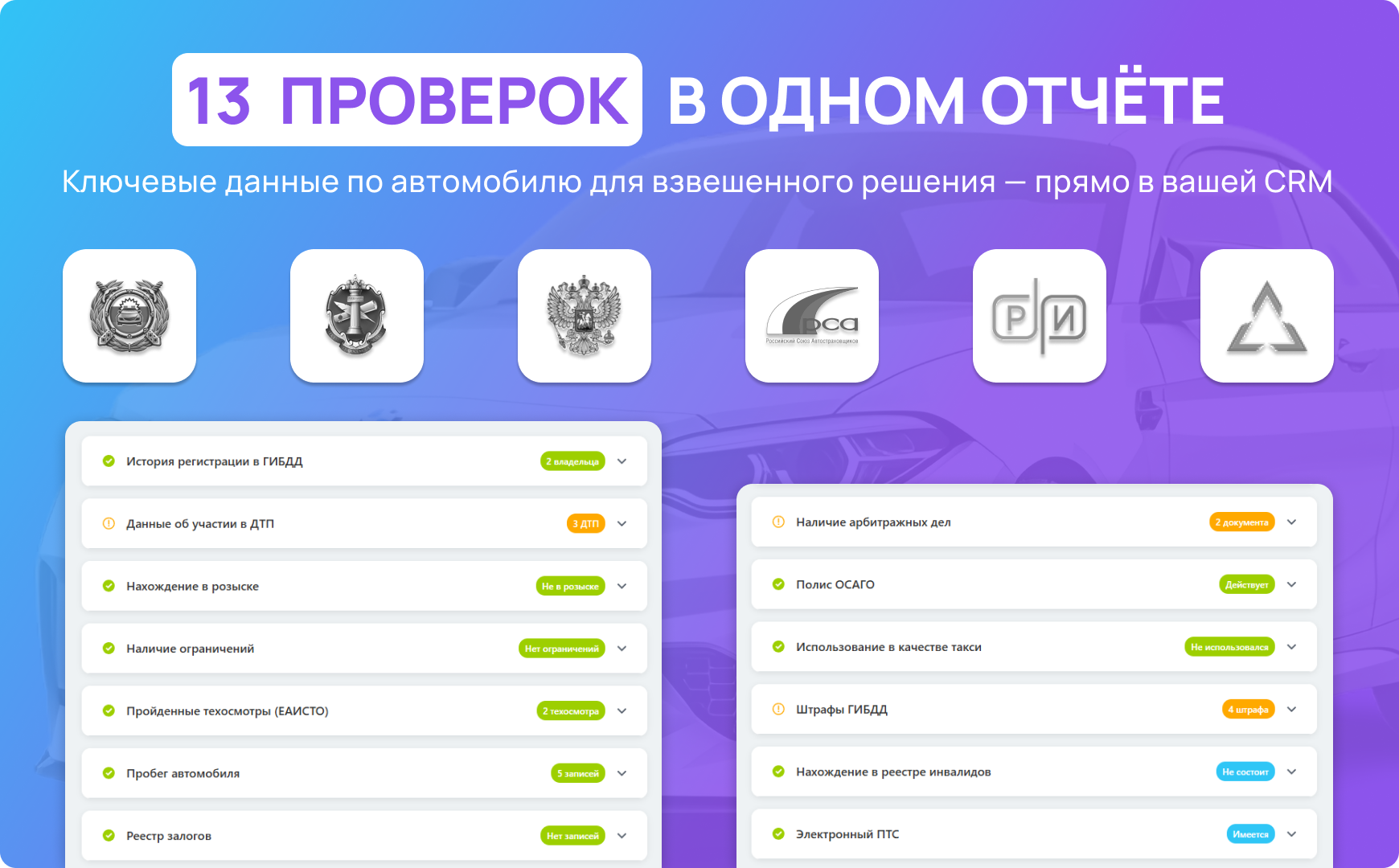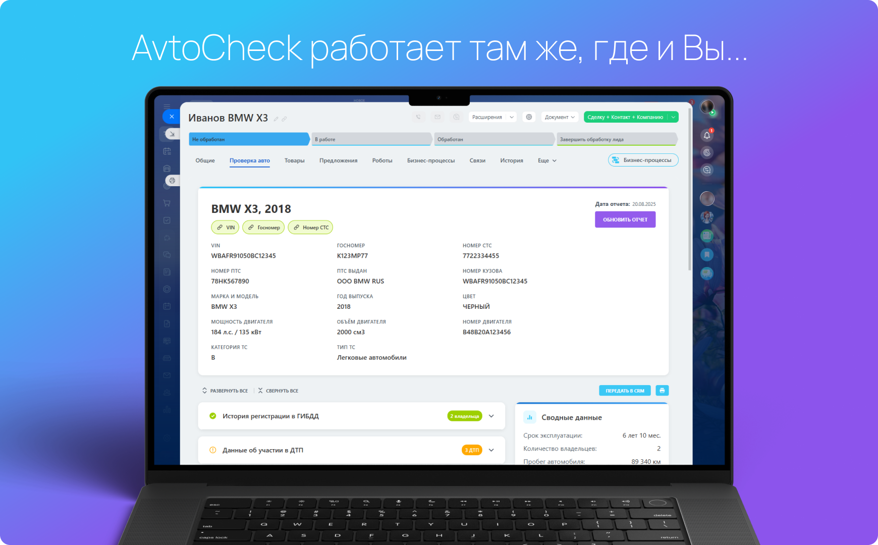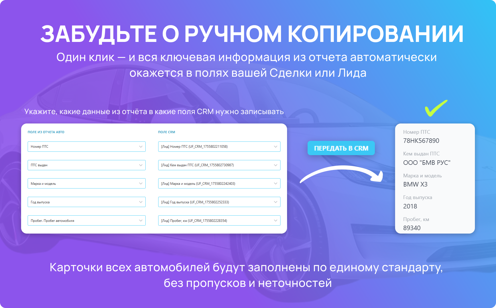 - Автозаполнение: После проверки данные о пробеге, владельцах и ДТП сами запишутся в поля Лида или Сделки.