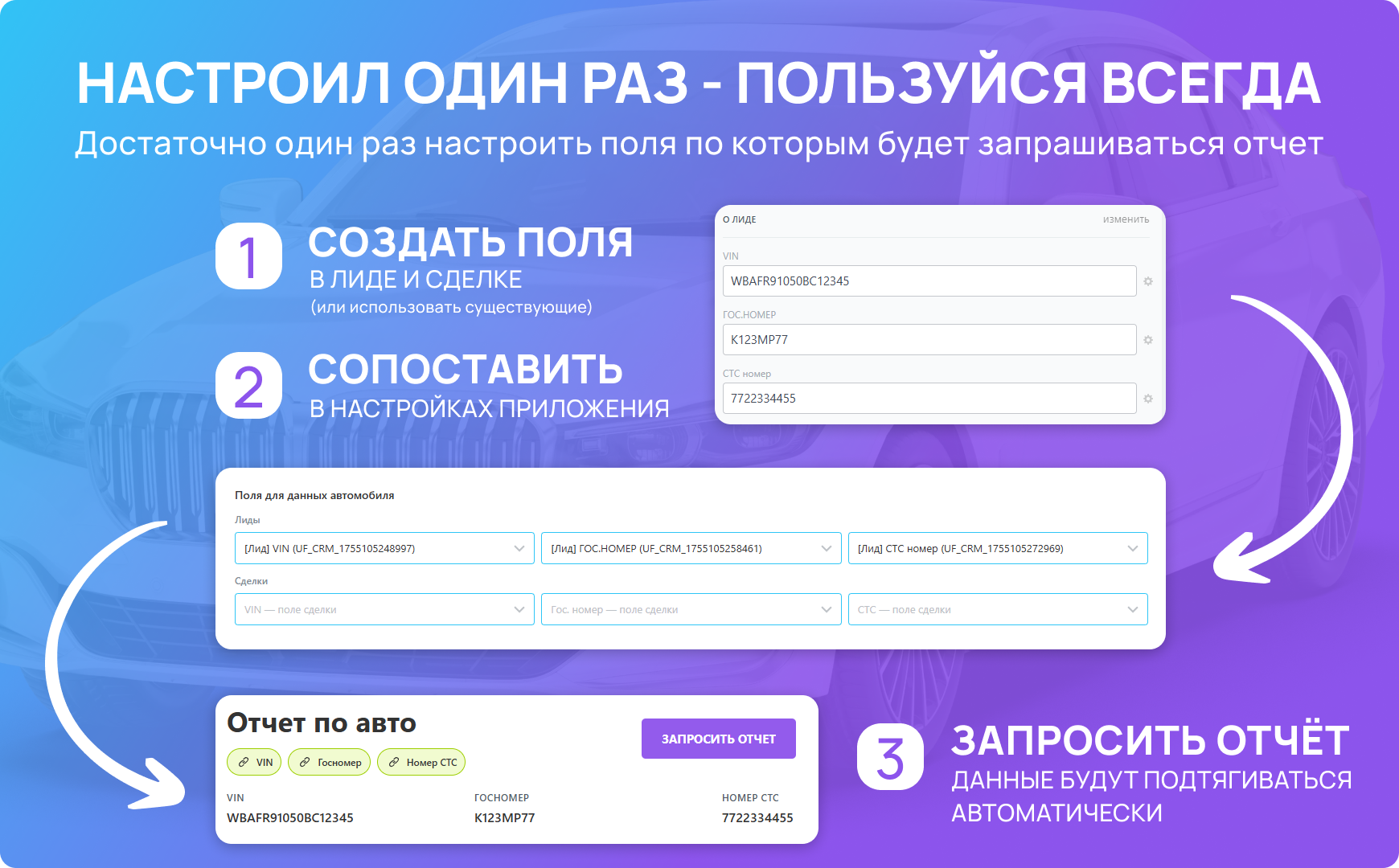 - Исключение ручного ввода: Автоматически забирайте VIN, госномер или номер СТС из полей CRM для проверки и возвращайте данные из отчета обратно в нужные поля. Экономьте до 10 минут на каждом авто.