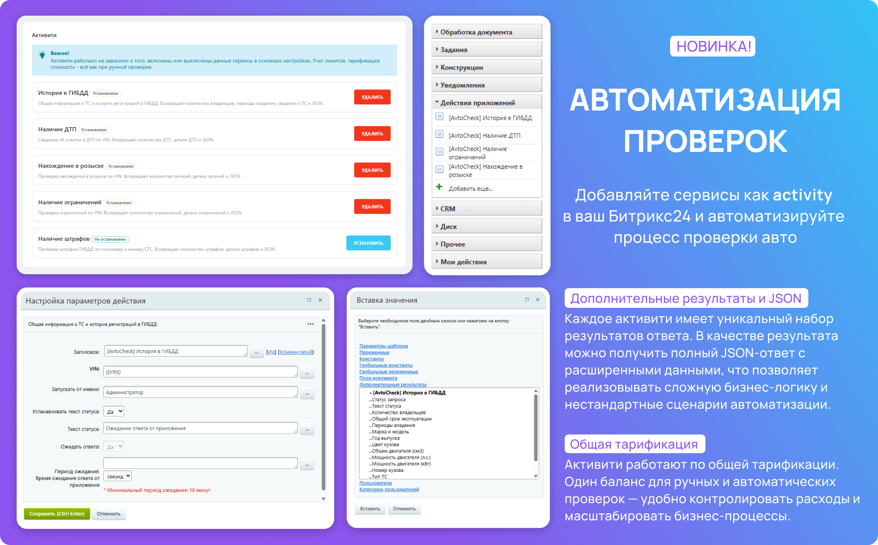 - Автоматизация: Добавляйте активити для проверки авто в свои бизнес-процессы