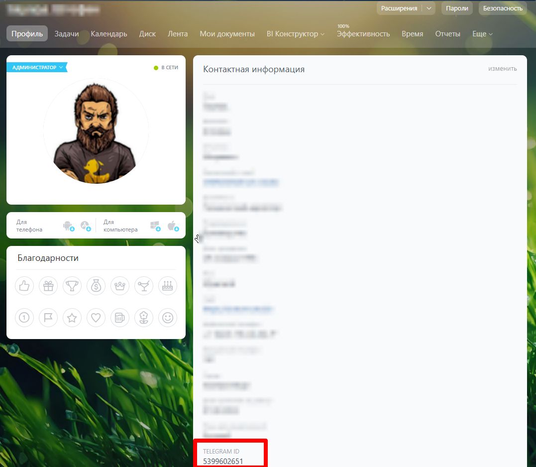 В профиле сотрудников появится поле для Telegram ID. Заполнив это поле вы сможете отправлять сообщения сотрудникам в Telegram, как обычные уведомления, указывая в настройках робота роль сотрудника (например, ответственного за лид), отдел или группу.