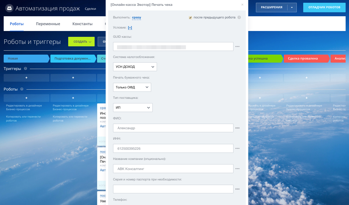- Робот печати чека позволяет формировать чек из вашего бизнес-процесса автоматически, например, при оплате в интернет магазине.