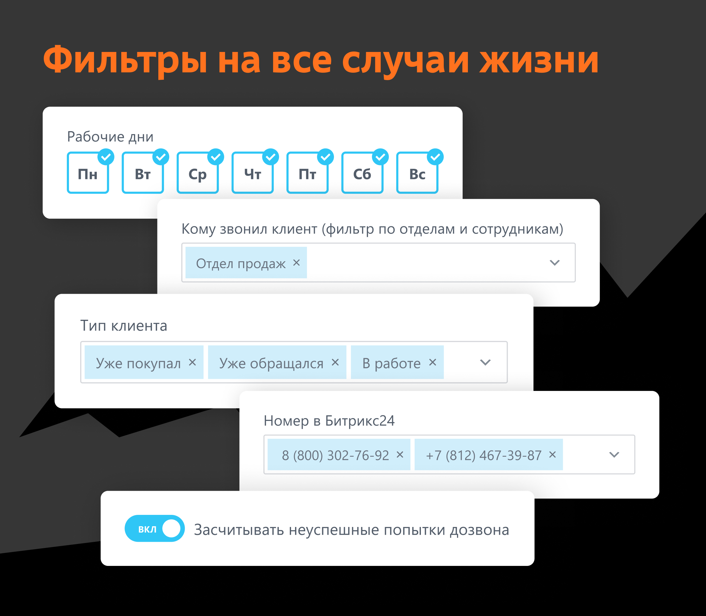 - кому звонил клиент (фильтр по отделам и сотрудникам)