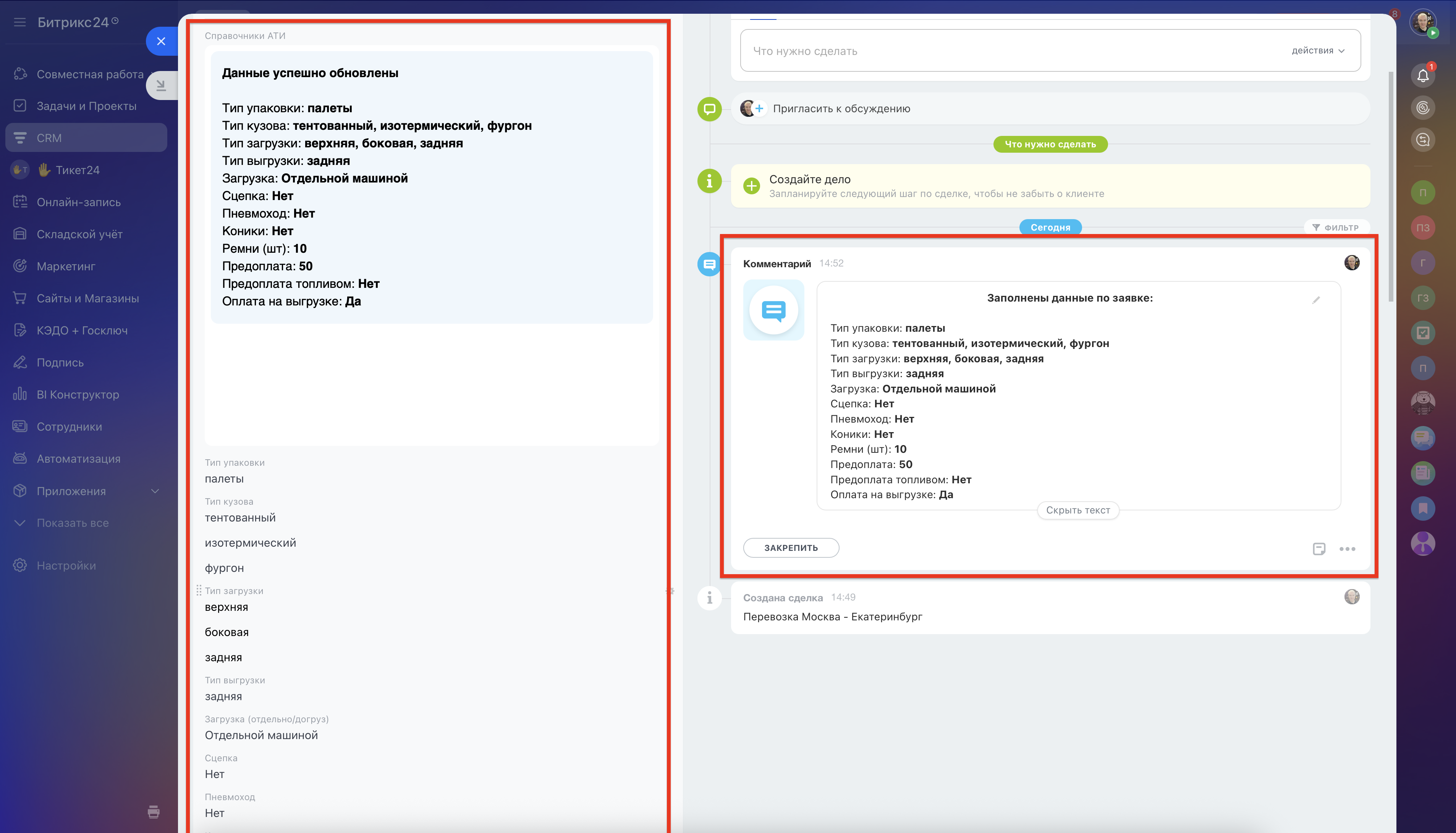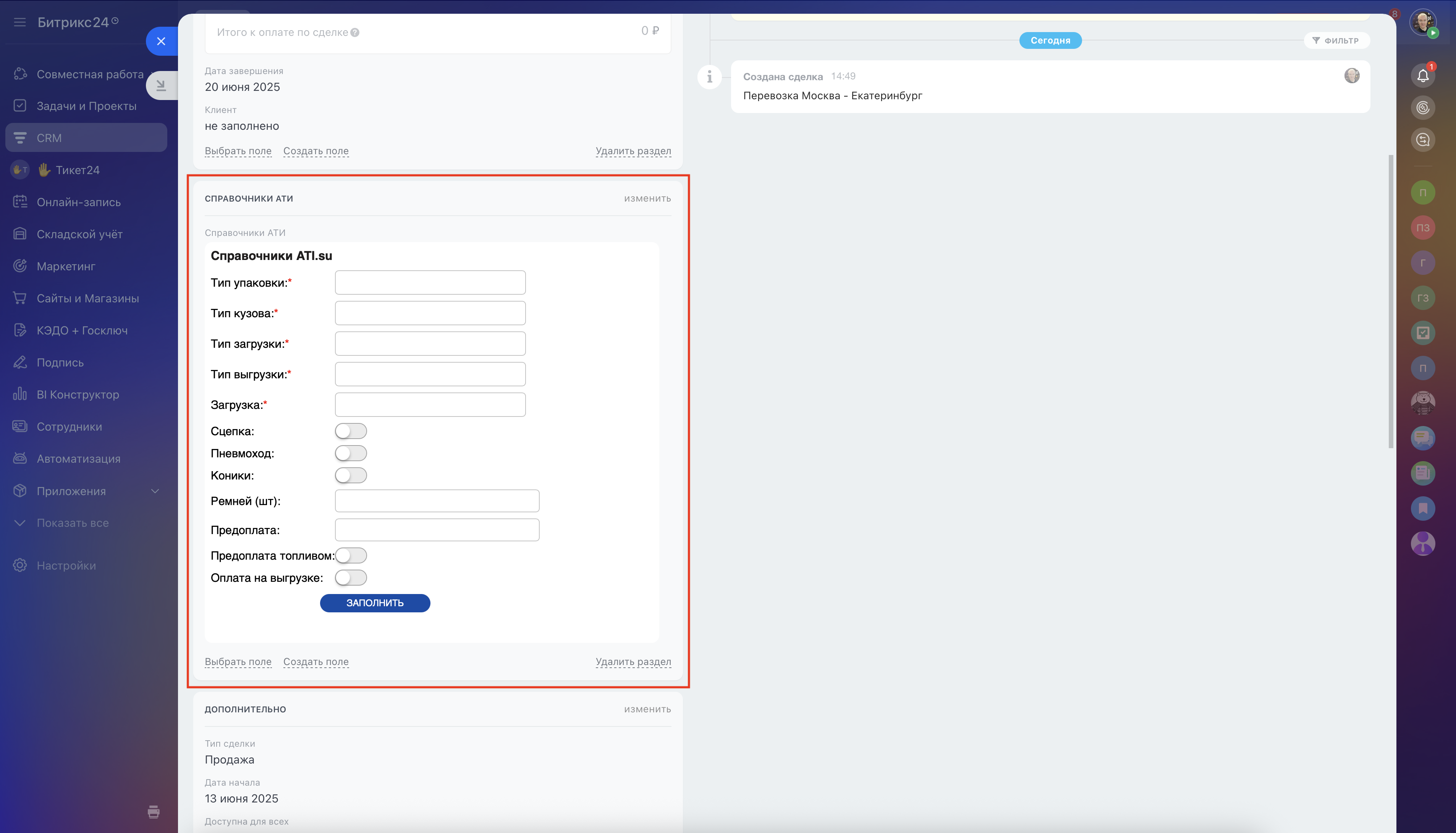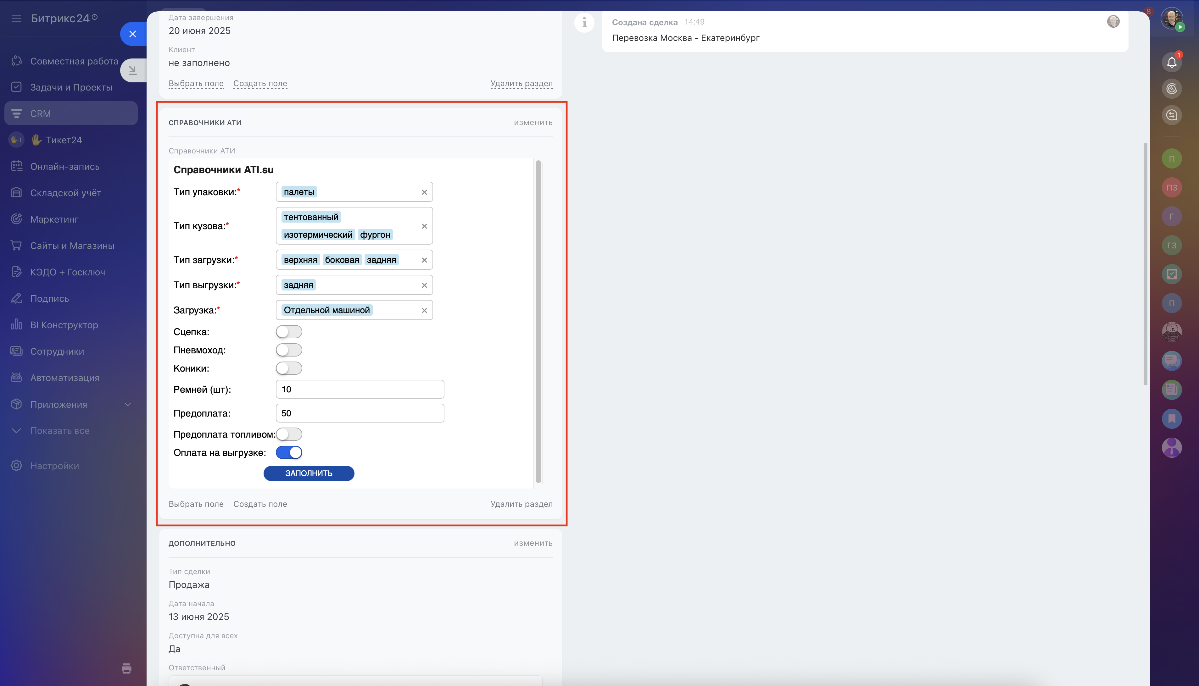 Забудьте о путанице в типах кузова или типах загрузки! Все специфичные справочники ATI.SU для заявок — уже в ваших лидах и сделках Битрикс24!