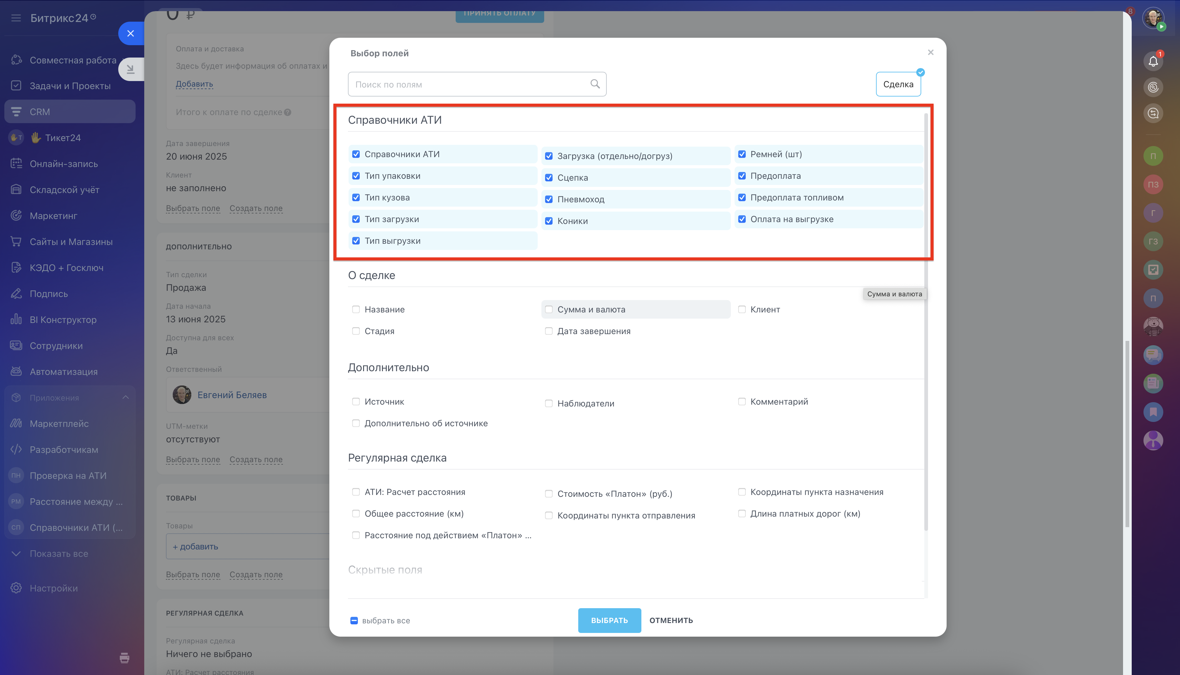 Готово! В карточках Лидов и Сделок автоматически появится специальное поле "Справочники АТИ".