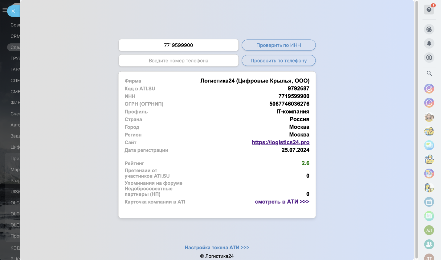 Проверка контрагента на АТИ по ИНН или номеру телефона.