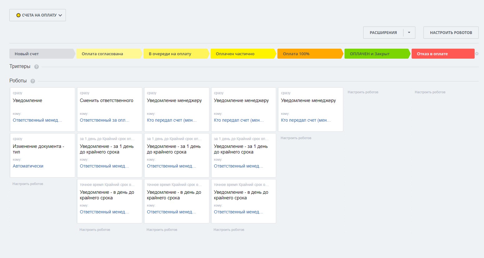- Стадия "В очереди на оплату" - бухгалтер взял в работу счет и запланировал оплату / уведомление менеджеру + контроль (дополнительные уведомления менеджеру по наступлению крайней даты оплаты)