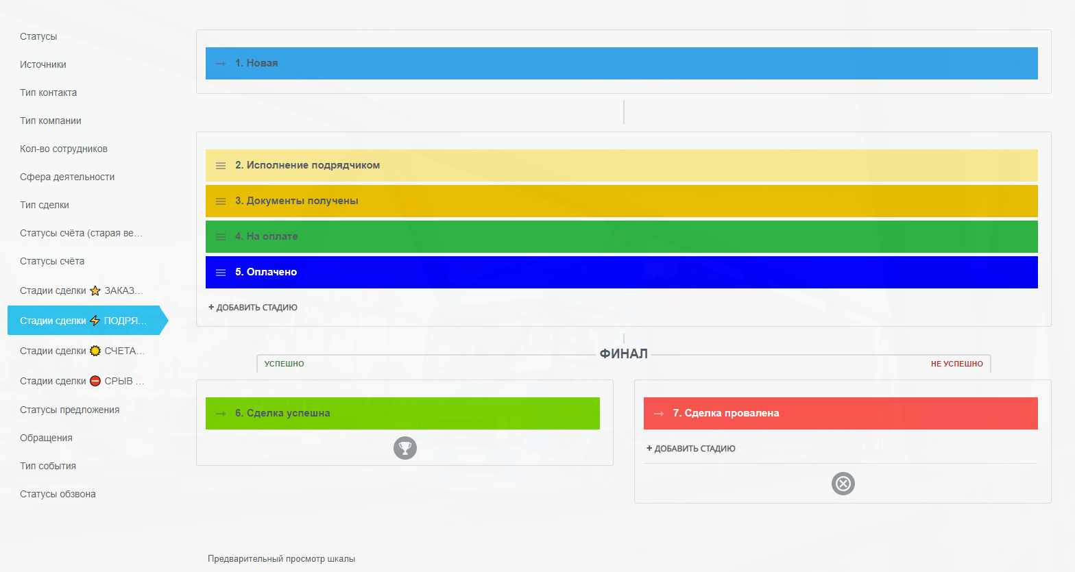 - Стадия "Оплата 100%" - бухгалтер переводит сделку на эту стадию после полной оплаты счета от Подрядчика / уведомление менеджеру