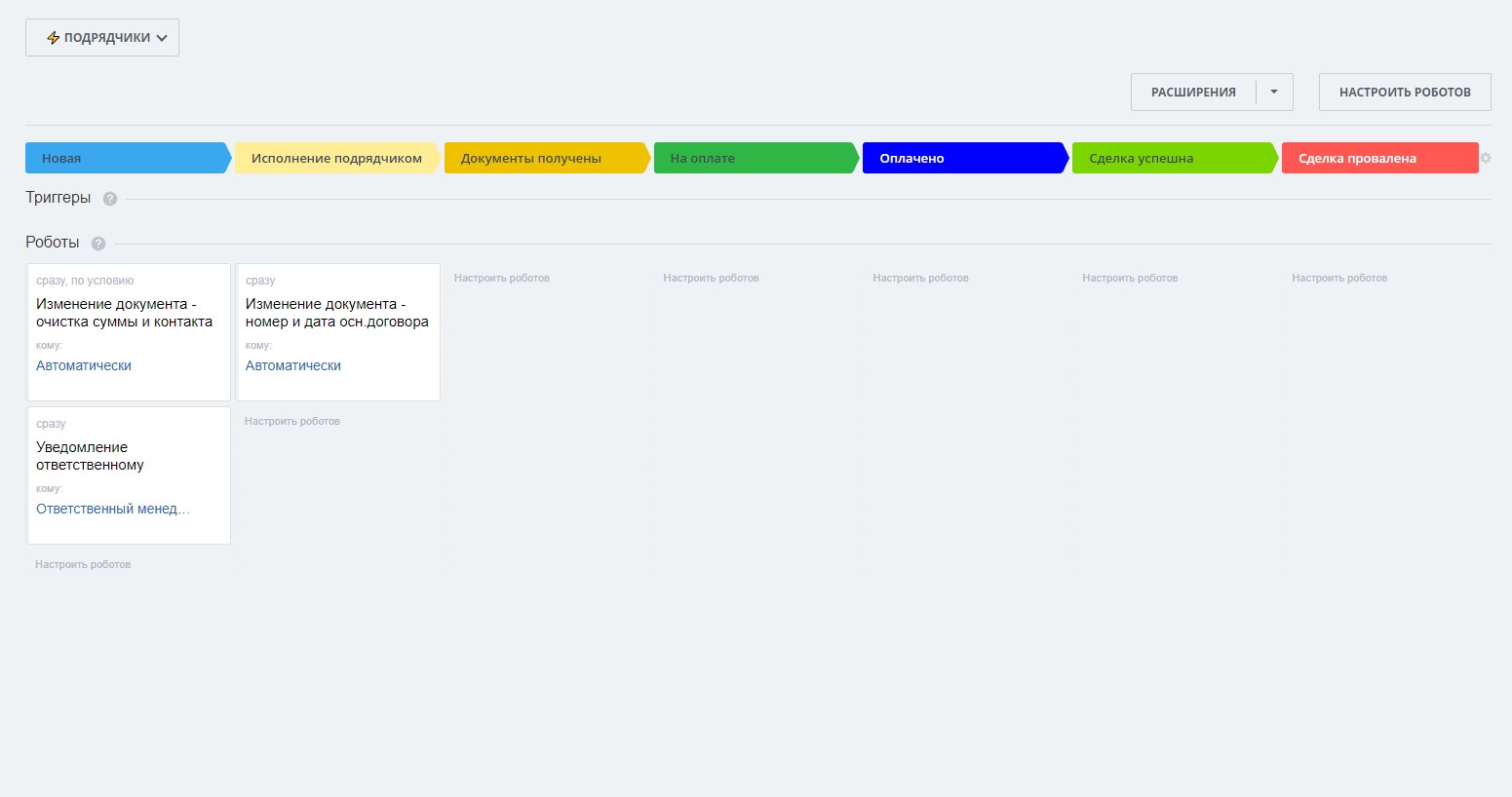 - Стадия "Оплачен частично" - на эту стадию переводим сделку при частичной оплате счета от Подрядчика / уведомление менеджеру + контроль (дополнительные уведомления менеджеру по наступлению крайней даты оплаты)