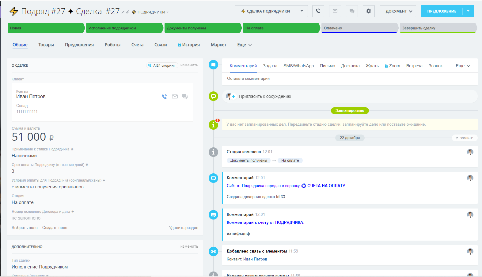- Стадия "Документы получены" - заполнение обязательных полей: "Документы на оплату от Подрядчика", "Сумма к оплате от Подрядчика (руб.)", "Крайний срок оплаты Подрядчику"