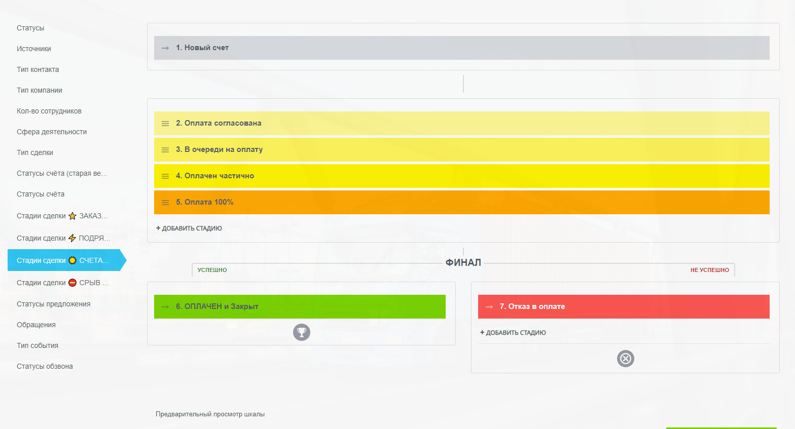 3. воронка "Счета на оплату" (рабочее место бухгалтера, каждая сделка - это счет от Подрядчика)