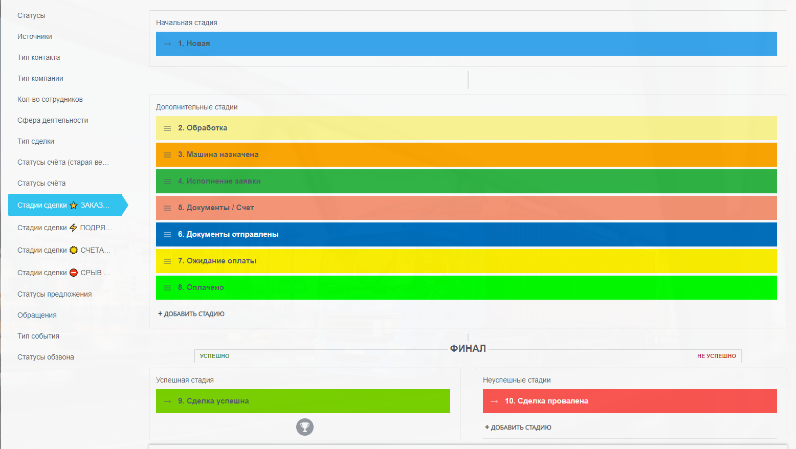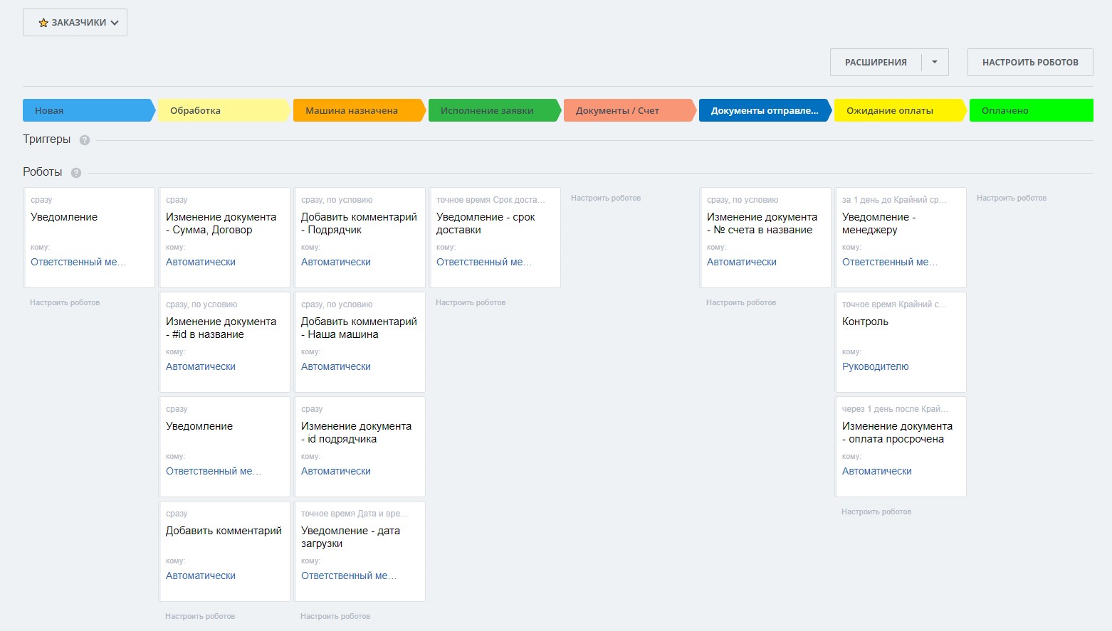 1. воронка "Заказчики" (работа с заявками на перевозку от Заказчика)- Стадия "Новая" - создание сделки / уведомление менеджеру