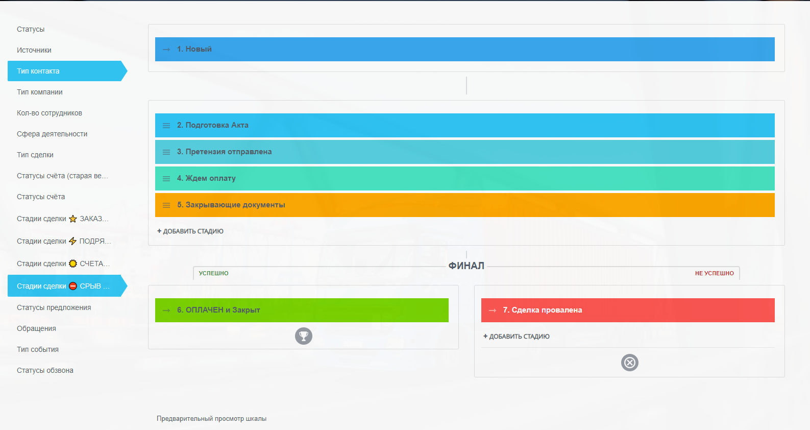 - Стадия "Претензия отправлена" - на эту стадию переносим сделку после формирования и отправки Акта о срыве Заказчику