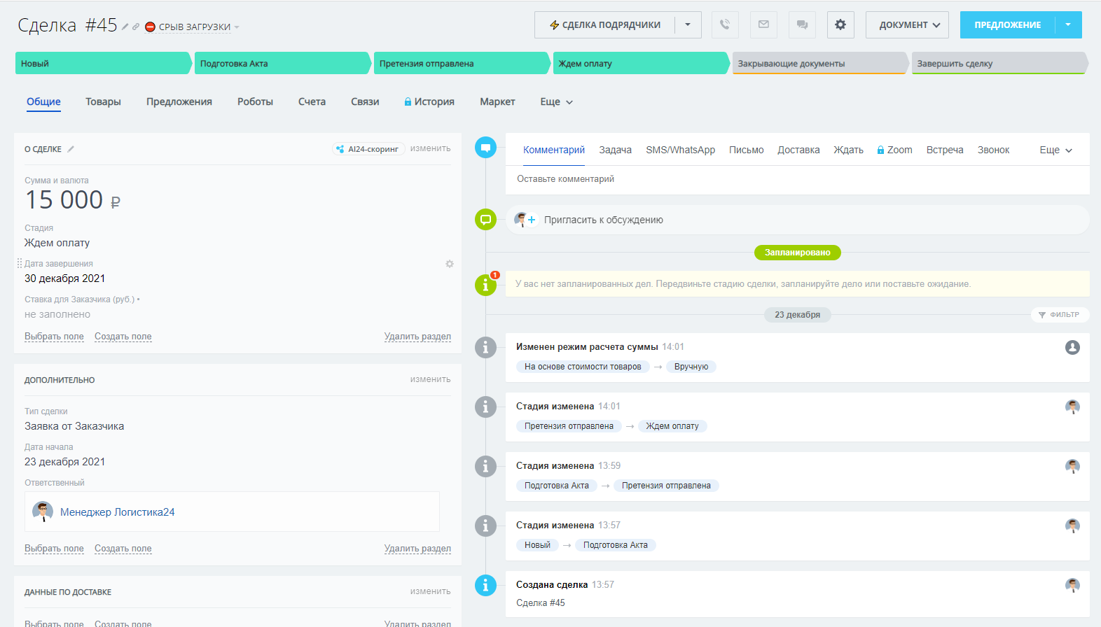 - Стадия "Обработка" - заполнение обязательных полей с данными по перевозке / автоматическое добавление в название id сделки и установка суммы сделки
