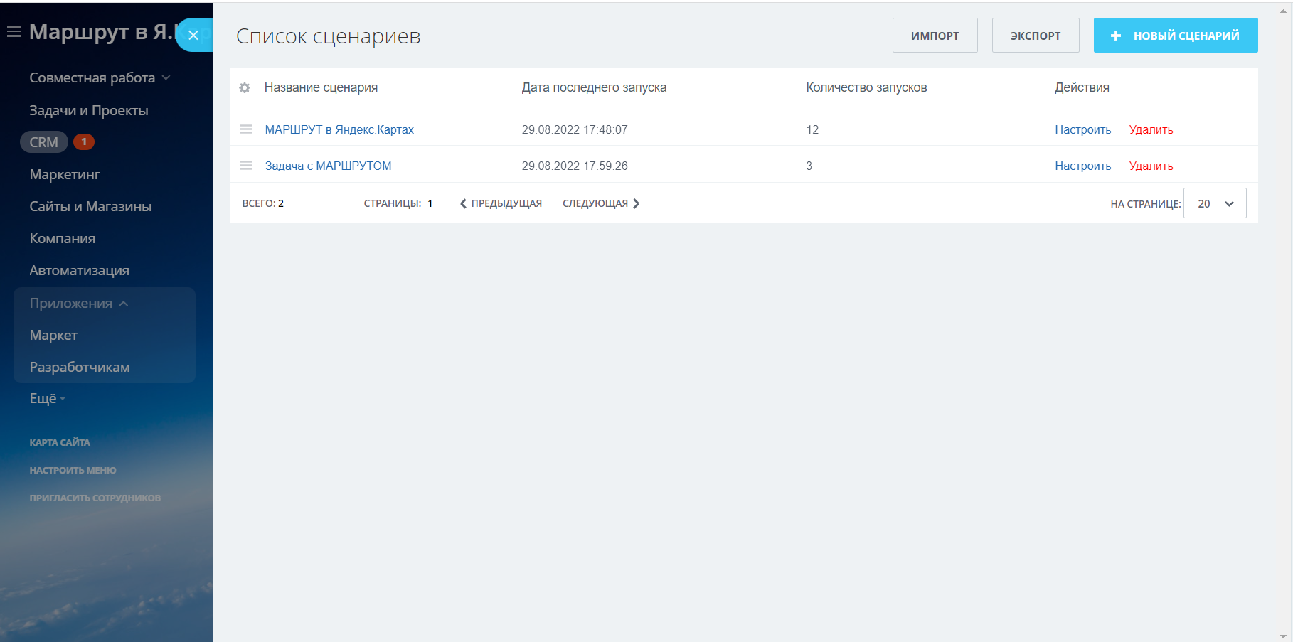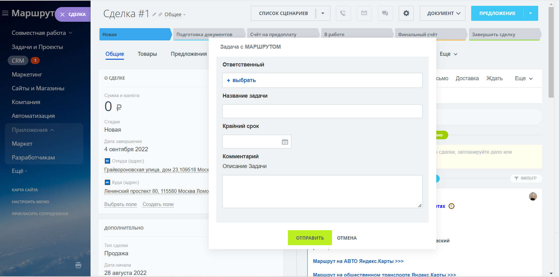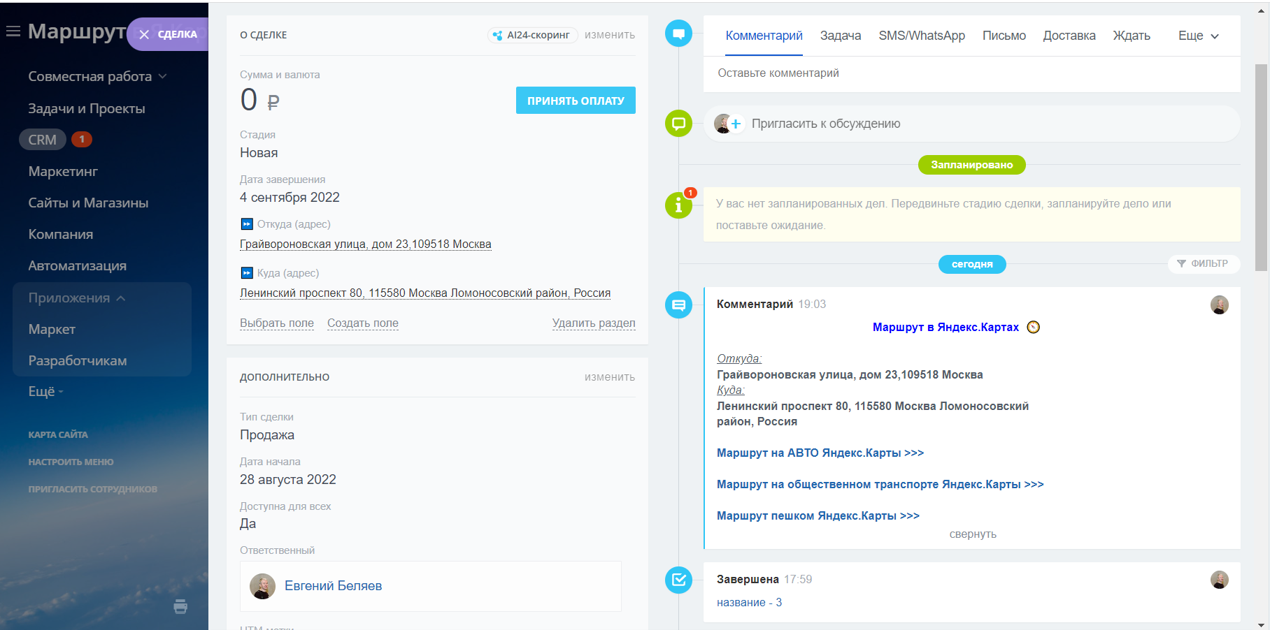 - Задача с МАРШРУТОМ - сценарий из сделки ставит Задачу сотруднику по указанным параметрам. В описании задачи будут ссылки на яндекс.карты с построенными маршрутами для автомобиля, на транспорте и пеший маршрут.