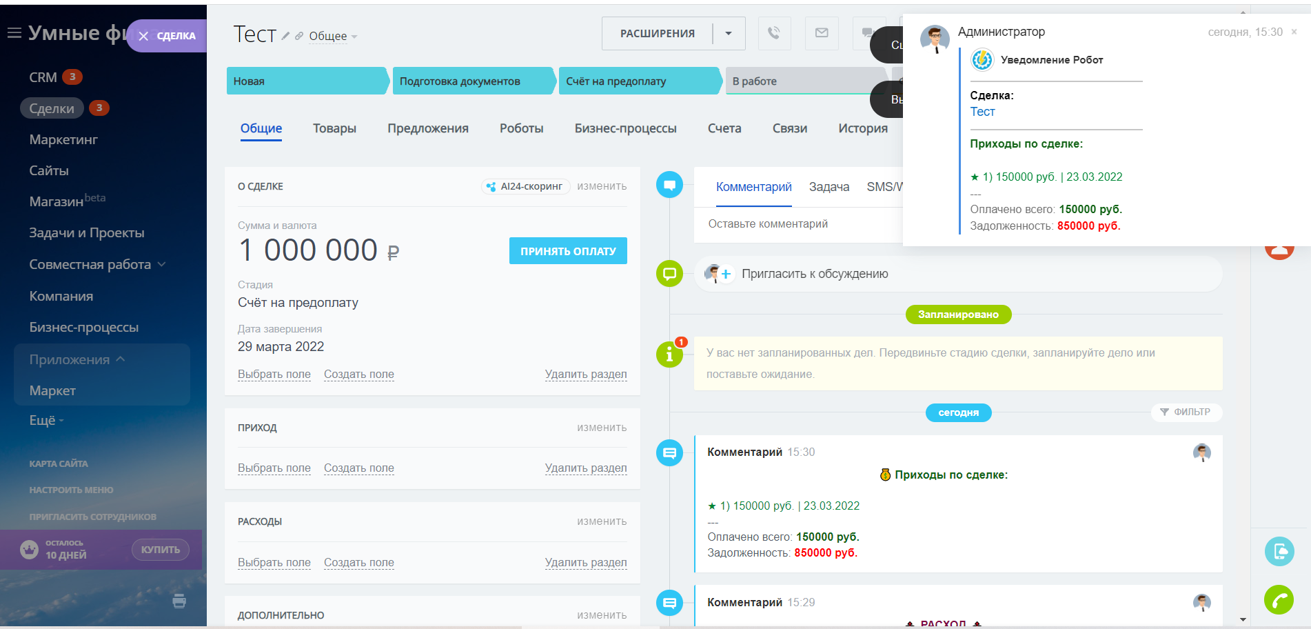 - ✅ Записать ПРИХОД - сценарий записывает сумму и дату прихода в сделку. Вычисляет сумму "Оплачено всего" и "Задолженность (остаток доплаты)". Выводит в комментарий информацию о приходе.