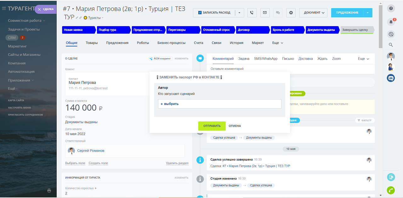 - ❕ ЗАМЕНИТЬ паспорт РФ в КОНТАКТЕ ❕ - сценарий заполняет паспортные данные клиента в карточку Контакта из текущей Сделки (для сделок в воронке ТУРИСТЫ)