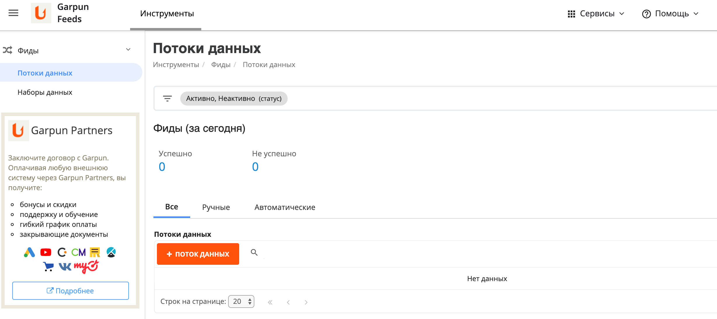- Переходим по вкладкам Инструменты - Фиды - Потоки данных.