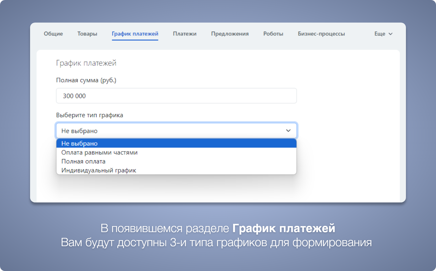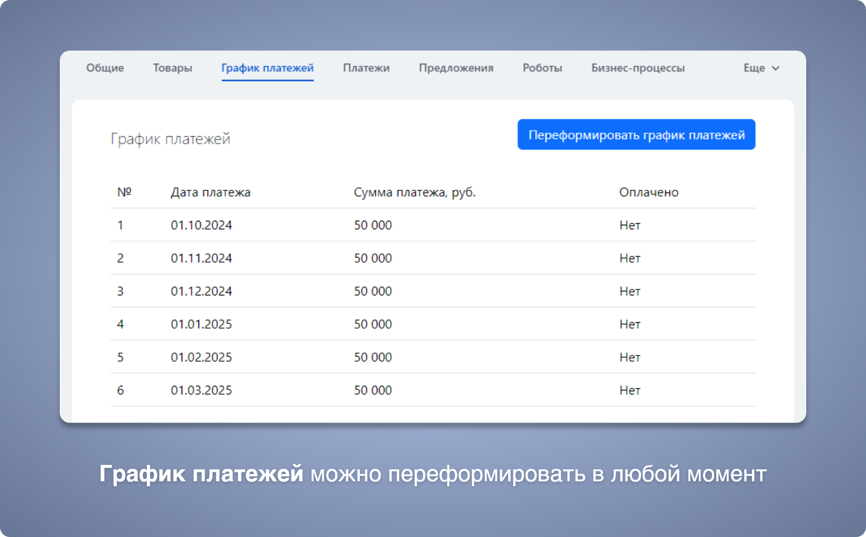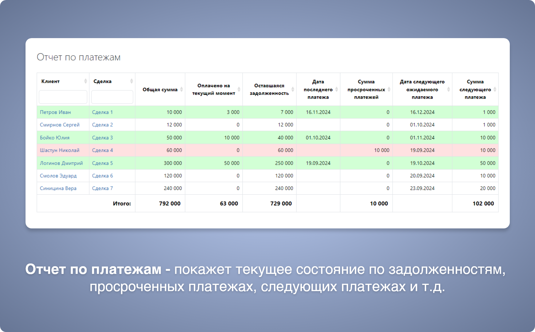 График платежей предоставит Вам возможность быстро и легко сформировать график платежей для каждой сделки или лида, отмечать оплату, а также контролировать оплаты, и не только через Отчет по платежам.