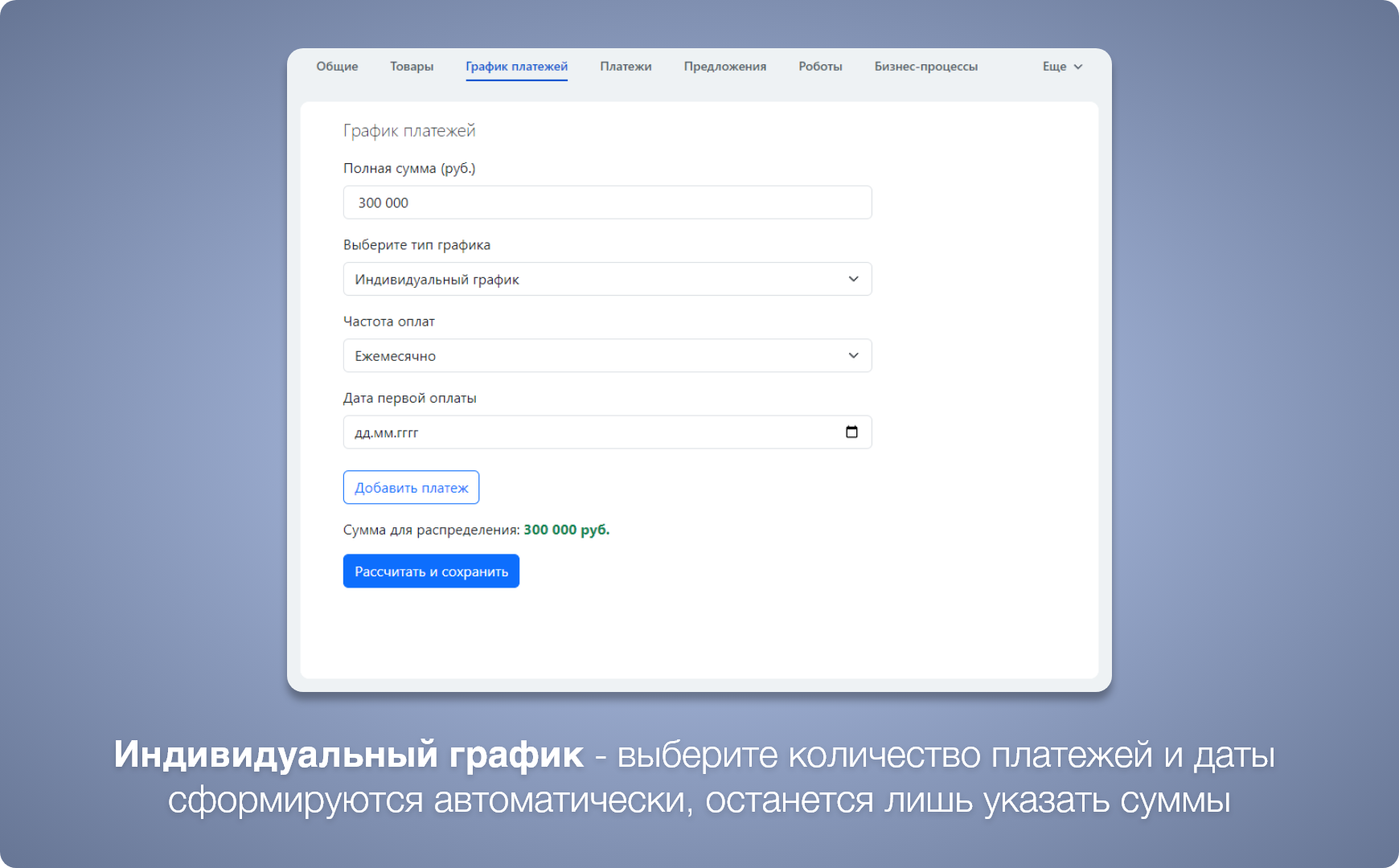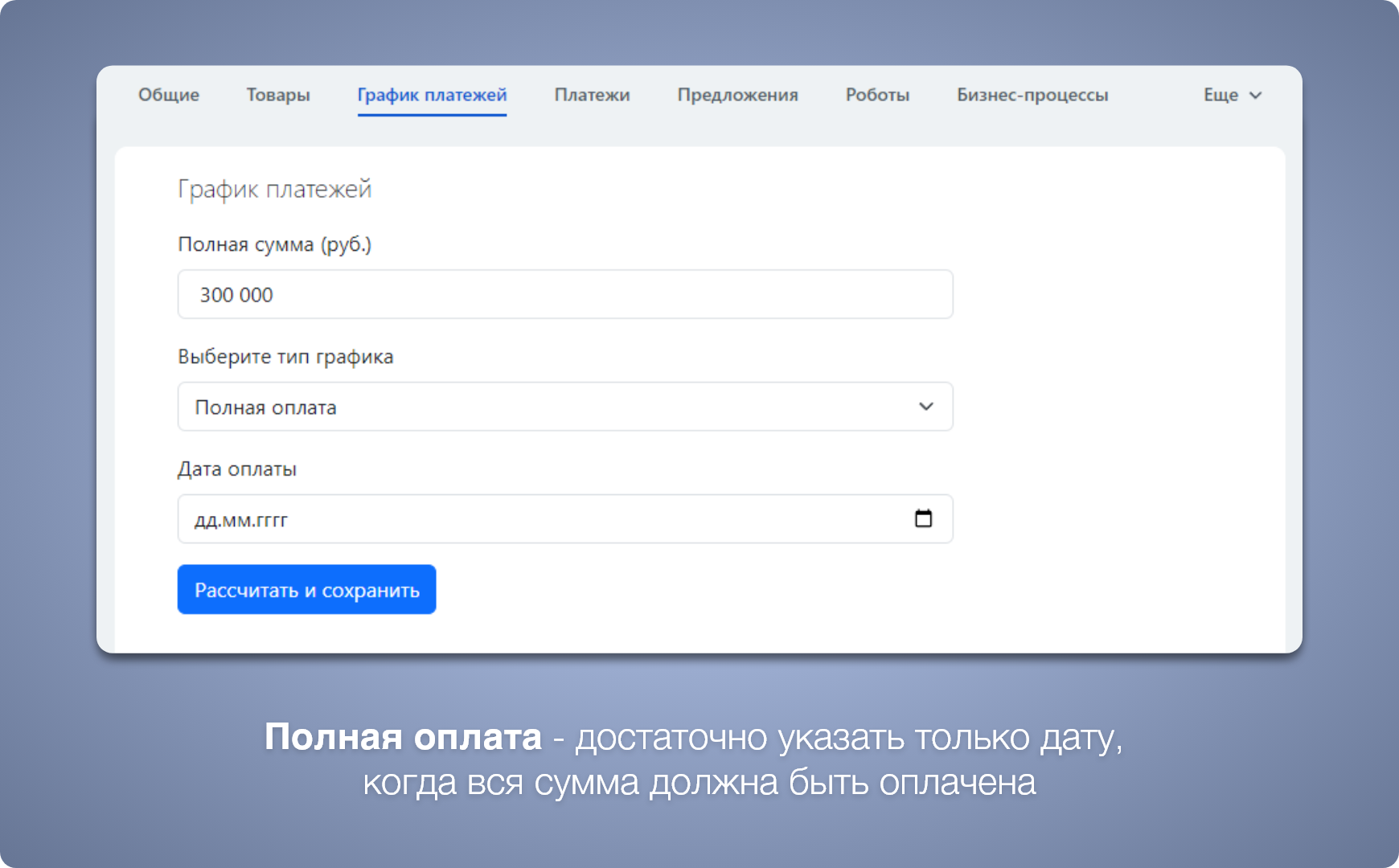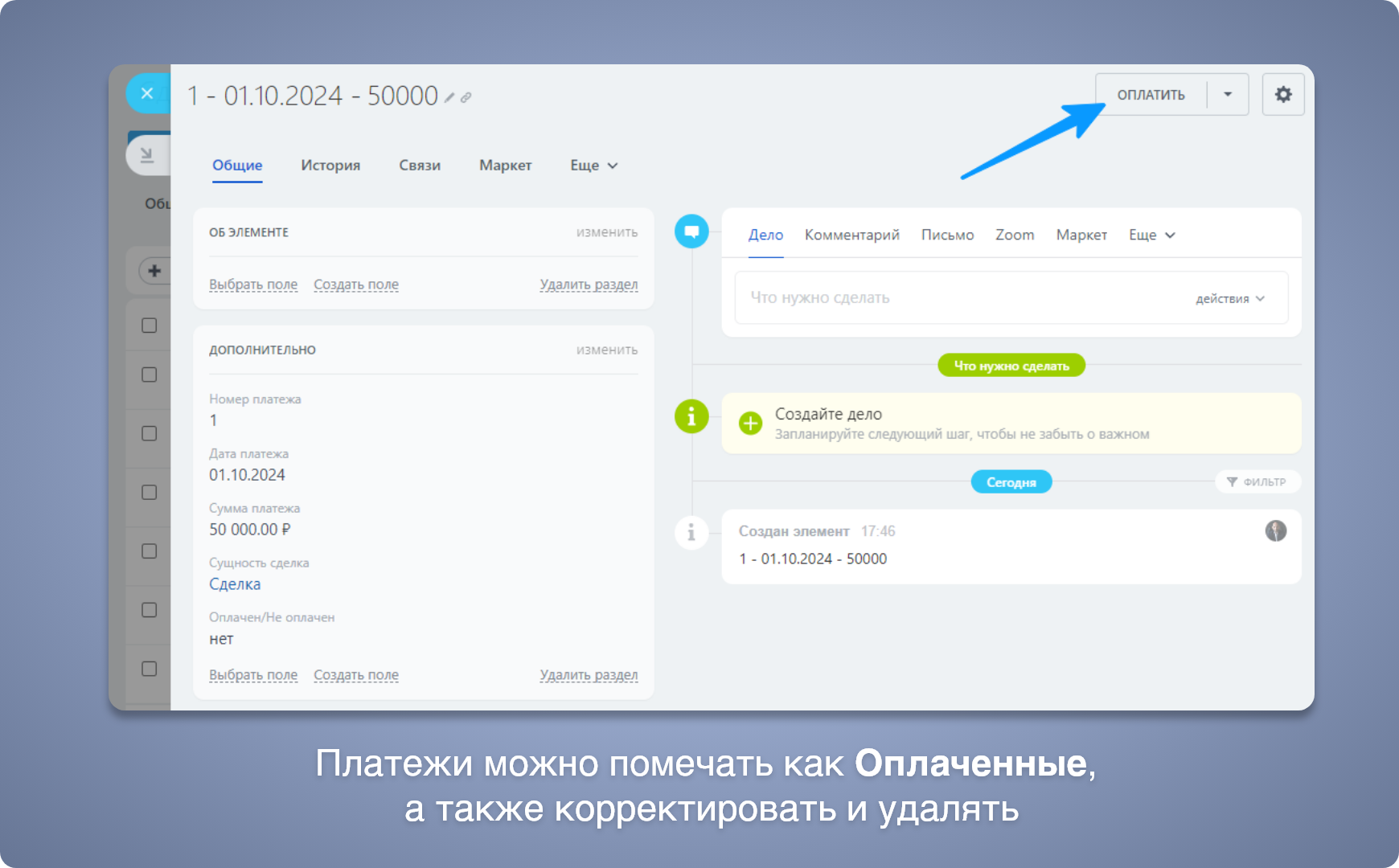 График платежей предоставит Вам возможность быстро и легко сформировать график платежей для каждой сделки или лида, отмечать оплату, а также контролировать оплаты, и не только через Отчет по платежам.