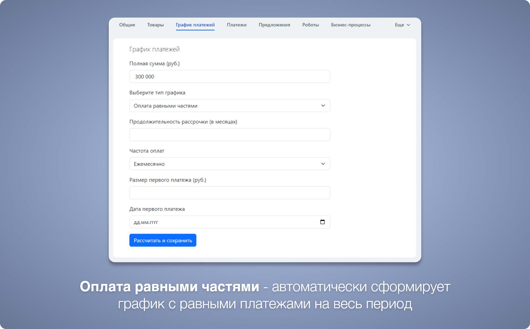 Установка стандартная. Никаких дополнительных действий не требуется. После установки в карточках сделки и лида появляются две вкладки - График платежей и Платежи. Во вкладке График платежей выполняется расчет графика. Во вкладке Платежи можно посмотреть список сформированных платежей и откорректировать их. Также в левом меню появится пункт Отчет по платежам.