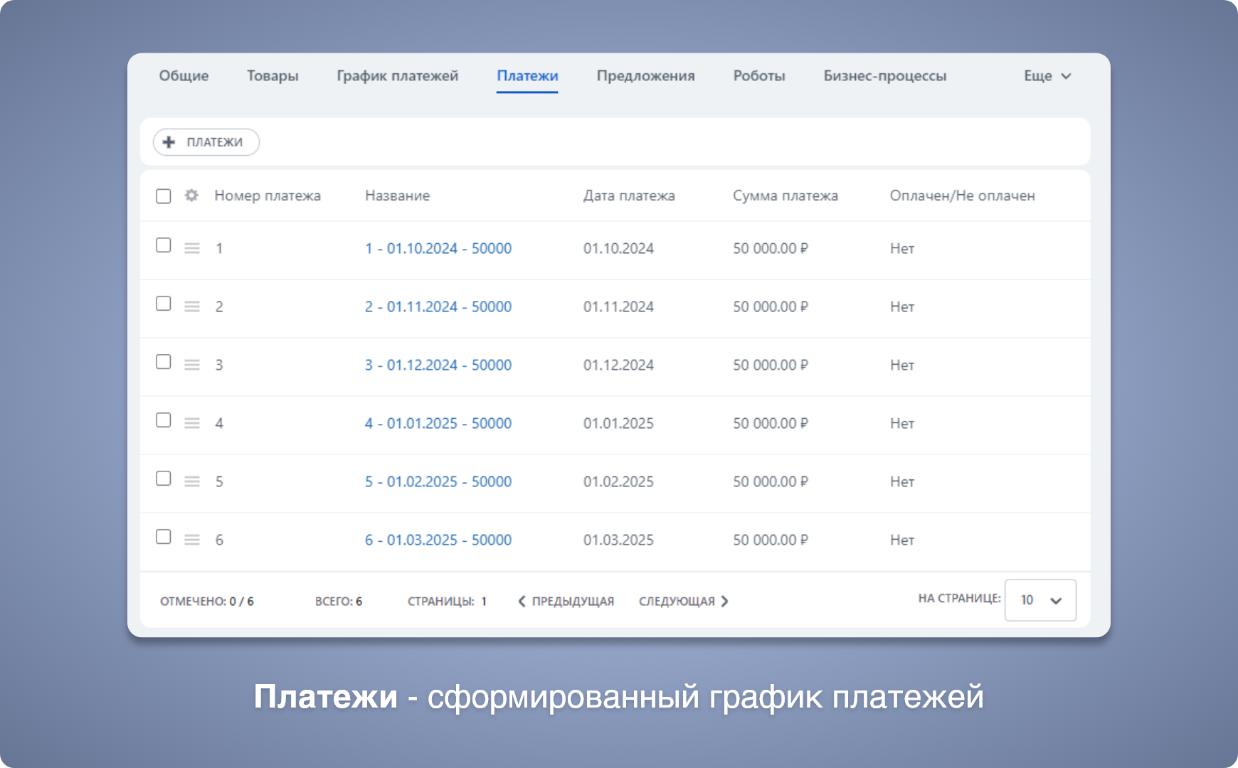 Результат расчета отобразится во вкладке "Платежи", где вы можете просмотреть все платежи по заданному графику, связанные с конкретной сделкой или лидом. Здесь вы можете вносить изменения или удалять платежи по вашему усмотрению, а также отмечать их оплату.