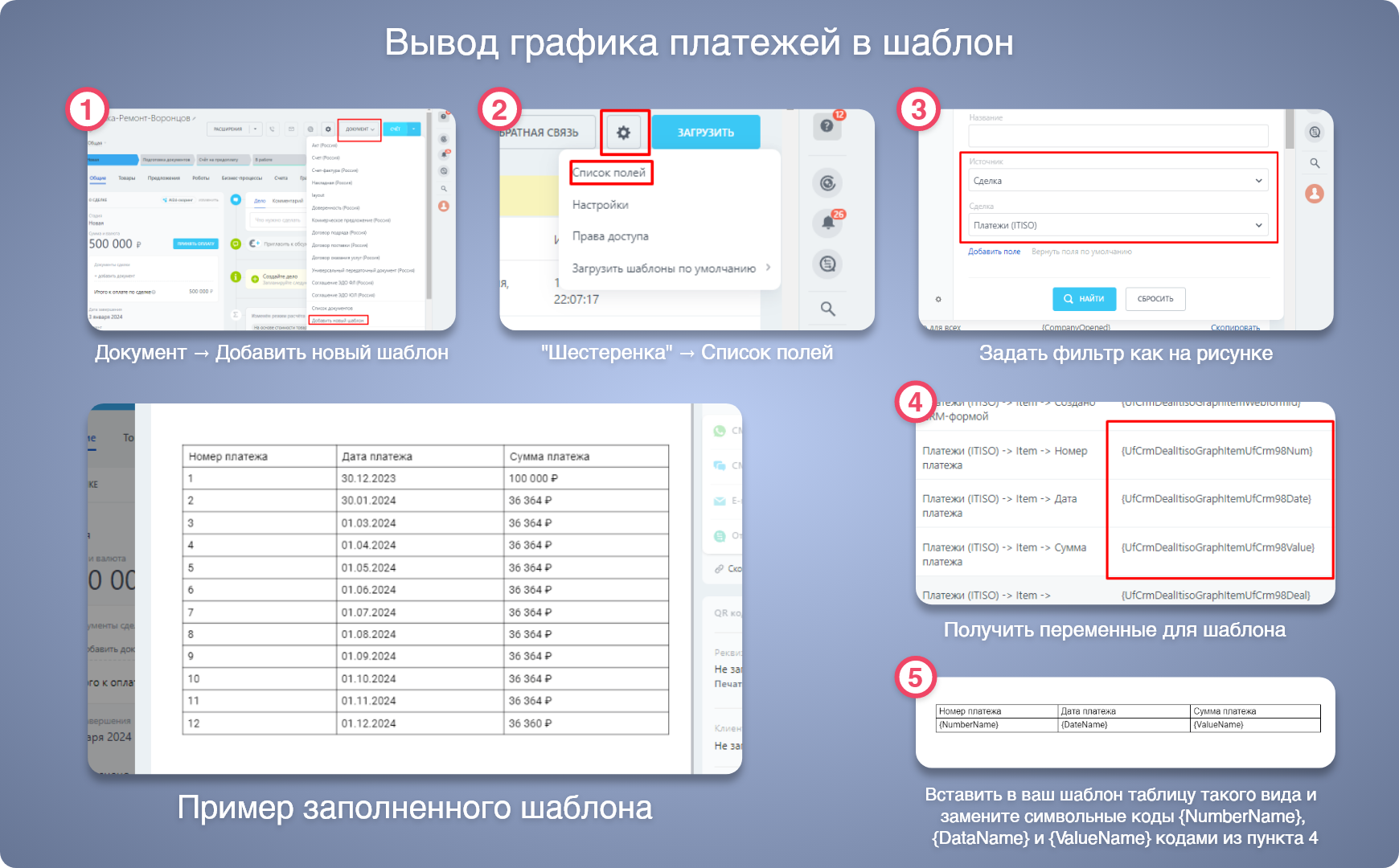 - Среди отфильтрованных полей нужно найти названия полей Номер платежа, Дата платежа, Сумма платежа и вставить символьные коды в таблицу вместо {NumberName}, {DateName}, {ValueName}.