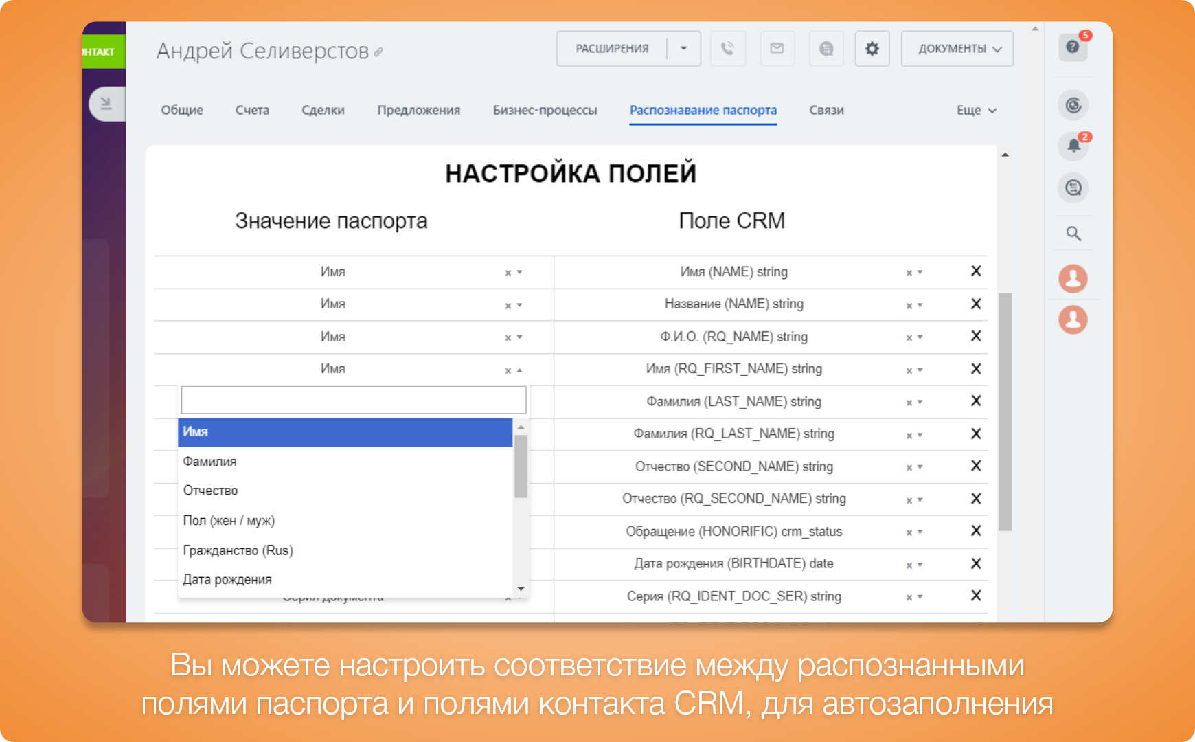 И самое главное, наше приложение дает вам полный контроль над настройками. Пользователи с правами администратора могут легко настроить соответствие между распознанными полями паспорта и полями контакта в CRM. Это позволяет вам адаптировать приложение под ваши уникальные потребности и обеспечивает максимальную гибкость в работе.