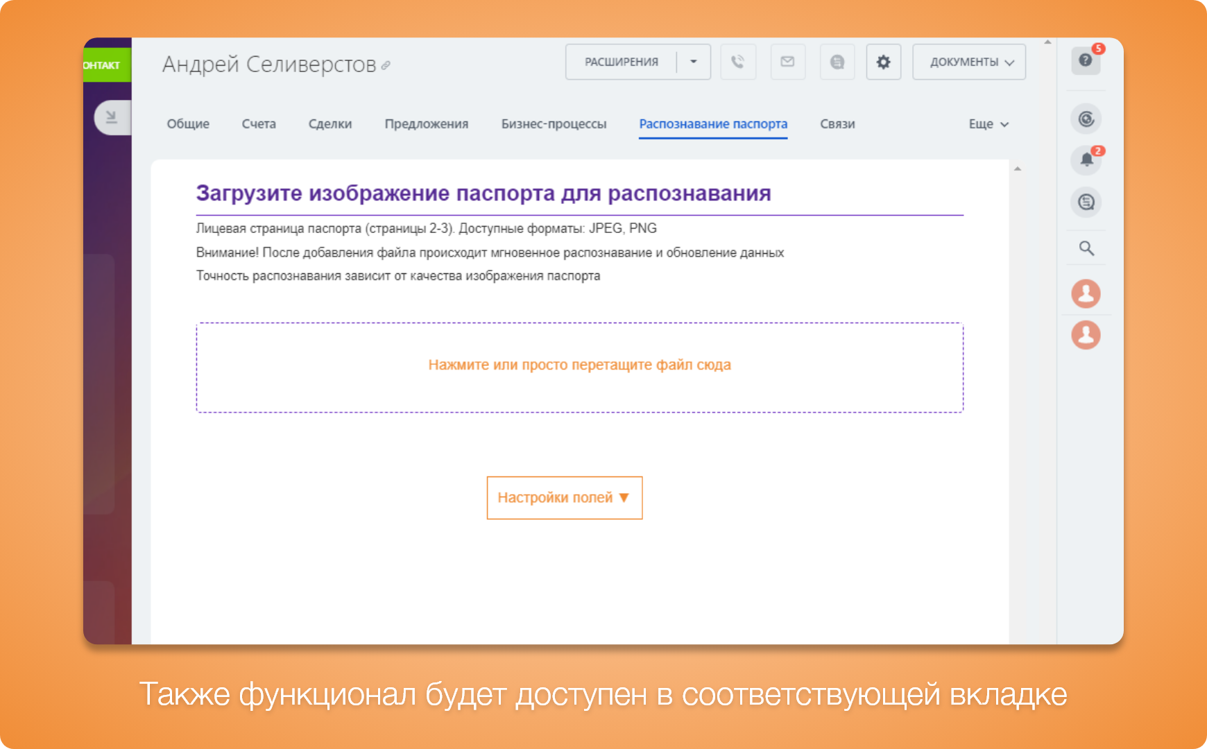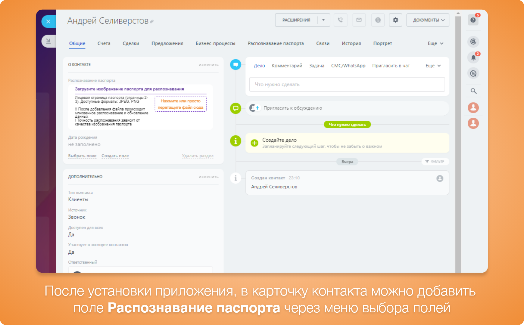 Что делает наше приложение еще более удобным, так это создание отдельной вкладки в карточке контакта, а также пользовательское поле, которое можно вывести во вкладке "Общие" и выполнять распознавание оттуда. Теперь вы сможете легко отслеживать и обновлять паспортные данные прямо из карточки контакта, без необходимости переключаться между разными страницами.