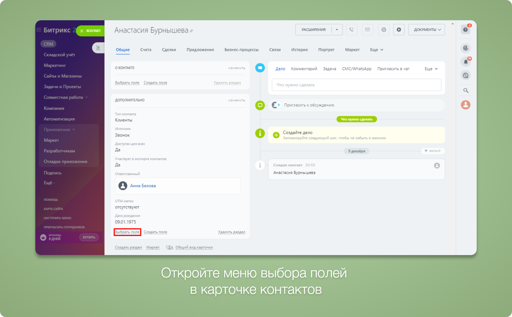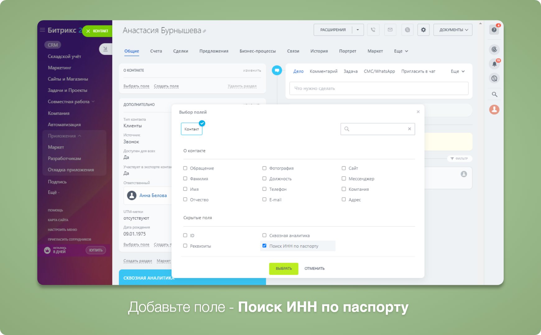 После стандартной установки приложения, в карточке контакта появляется новое поле под названием "Поиск ИНН по паспорту". Чтобы отобразить это поле, вам нужно открыть карточку контакта, нажать на кнопку "Выбрать поле" и отметить поле "Поиск ИНН по паспорту", поставив галочку напротив него. После этого поле будет отображаться в карточке контакта.