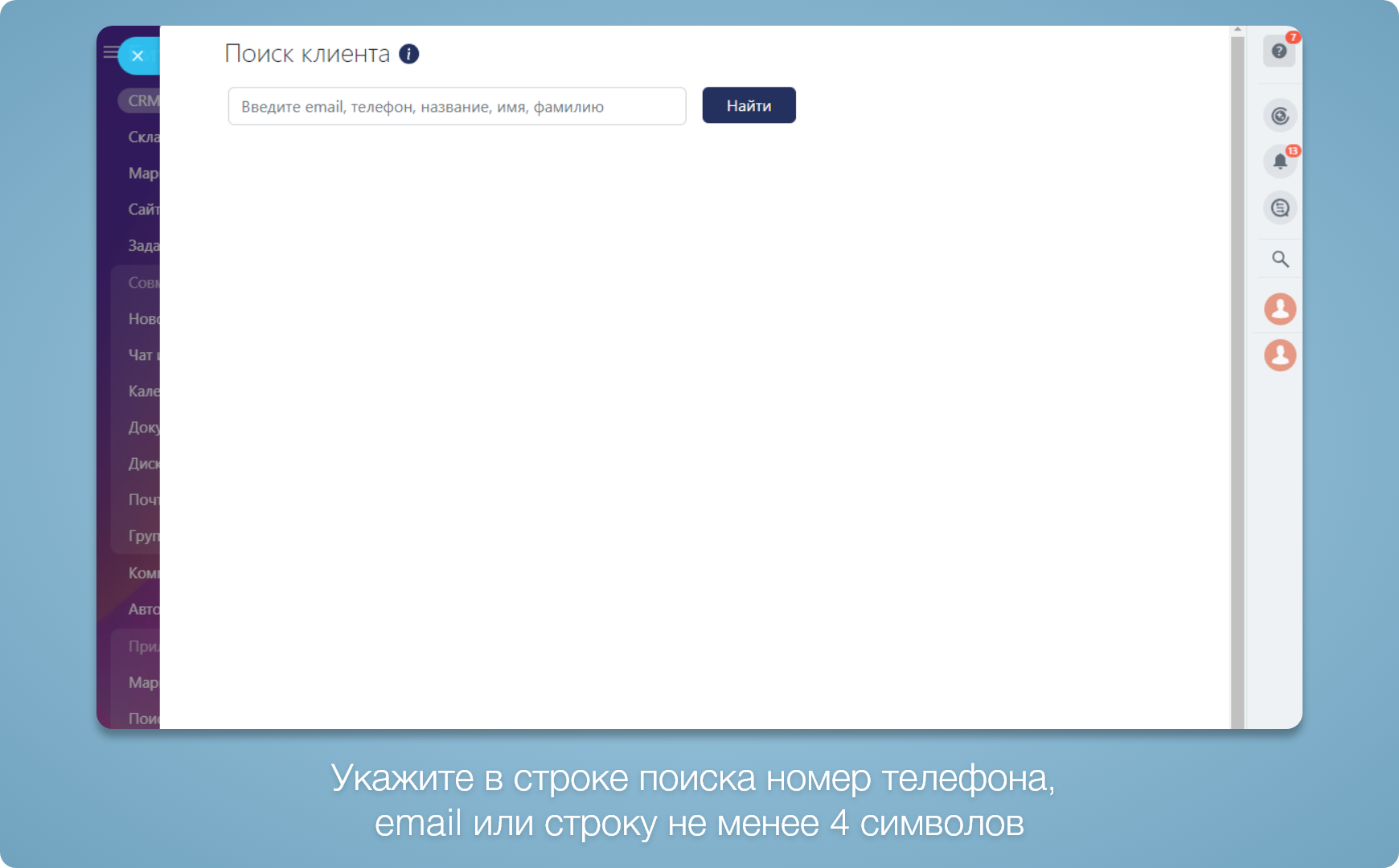 Для того чтобы использовать функцию поиска, достаточно ввести корректный телефон, email или строку длиной не менее 4 символов, которая будет использоваться для поиска по названию компании, имени или фамилии.