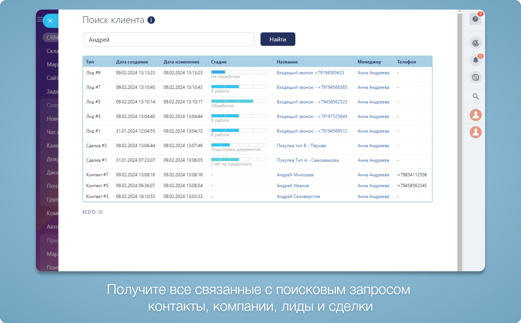 Поиск клиента - ваш надежный помощник в поиске контактов, компаний и лидов! Это инновационное приложение, которое позволяет вам быстро и легко находить не только сущности, связанные с заданным телефоном, email или названием компании, но и все связанные с ними контакты, компании, лиды и сделки.