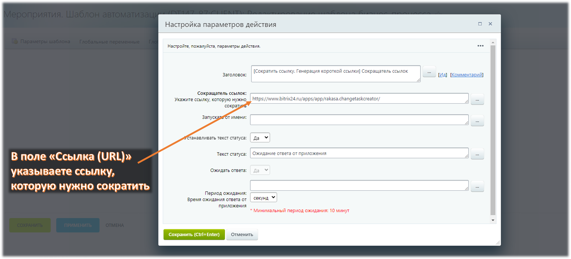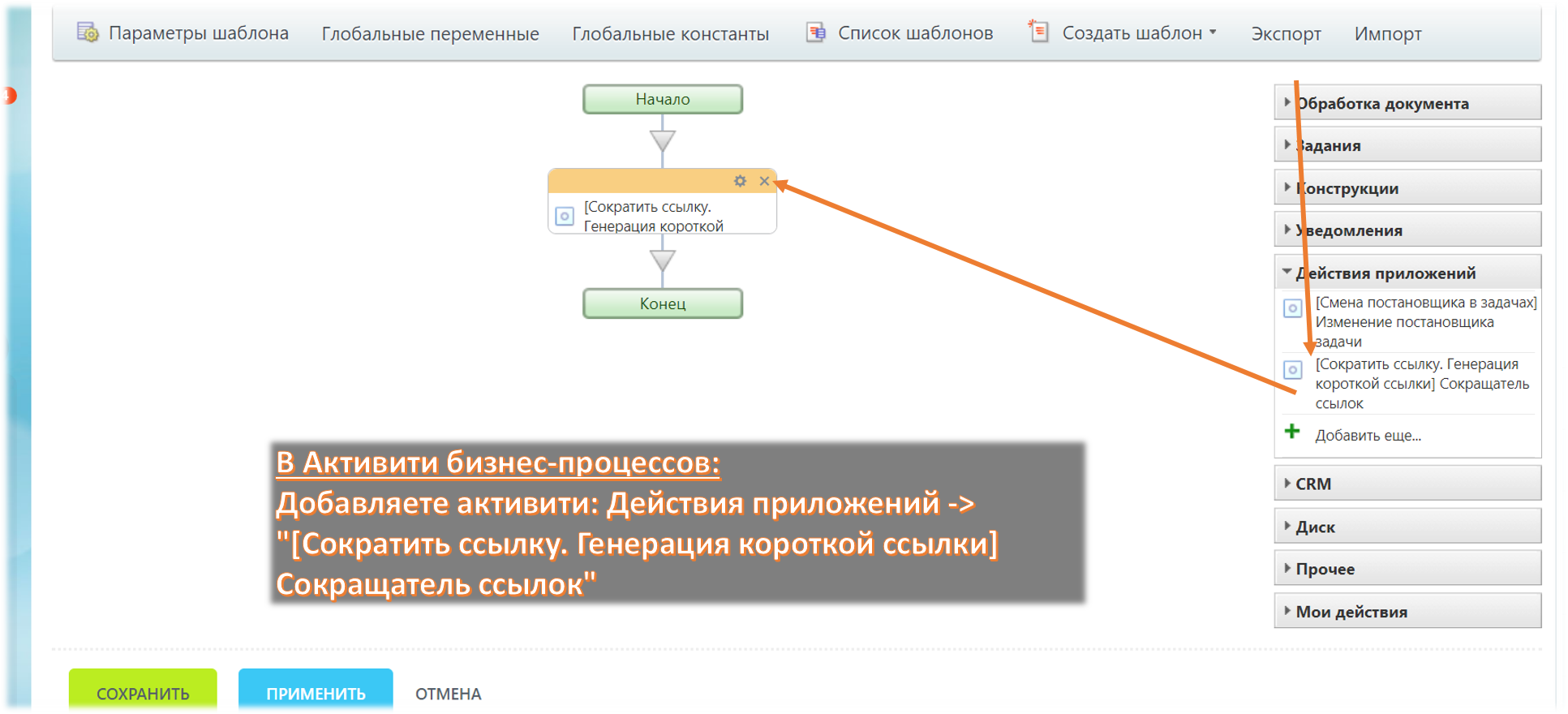 - Добавляете действие бизнес-процесса в дизайнере бизнес-процессов: Действия приложений -> "[Сократить ссылку. Генерация короткой ссылки] Сокращатель ссылок"