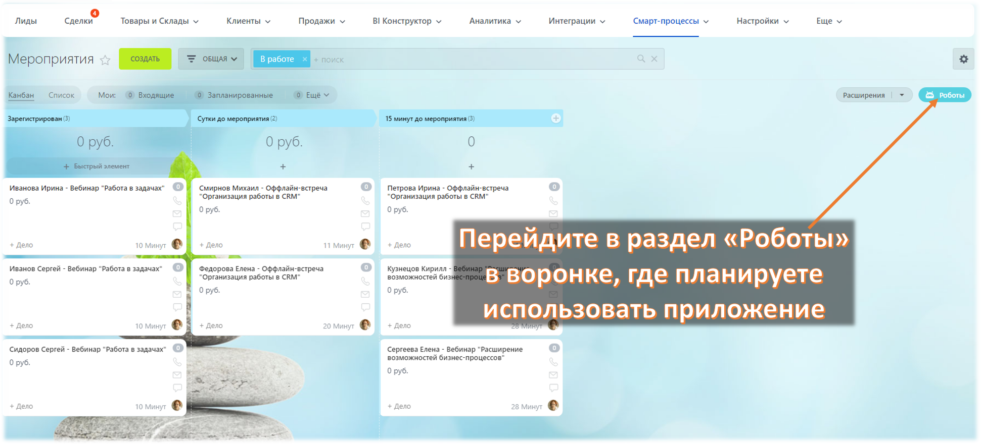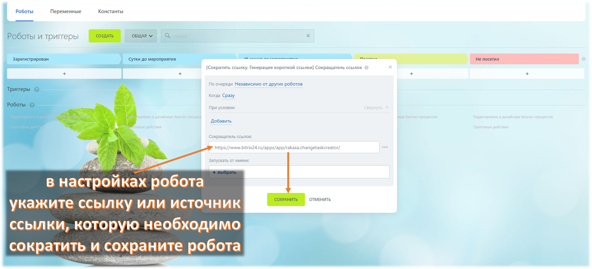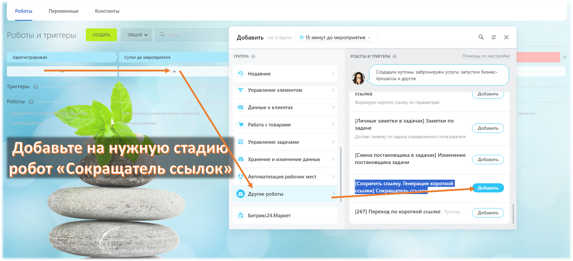 Добавляем робота "[Сократить ссылку. Генерация короткой ссылки] Сокращатель ссылок" на нужной стадии (Раздел “Другие роботы” -> “[Сократить ссылку. Генерация короткой ссылки] Сокращатель ссылок”)