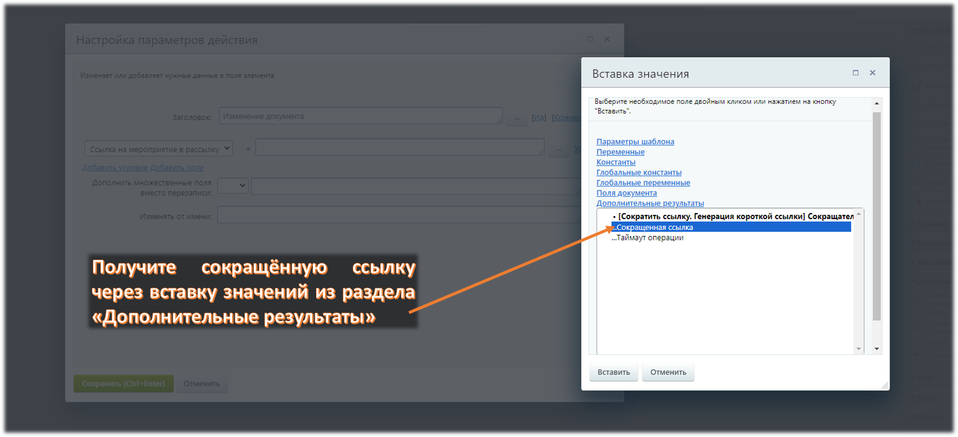 - Добавляем в поле переменную, для этого справа от поля жмем на “…”, находим раздел роботы -> [Сокращатель URL] Сокращатель ссылок” -> Сокращенная ссылка.