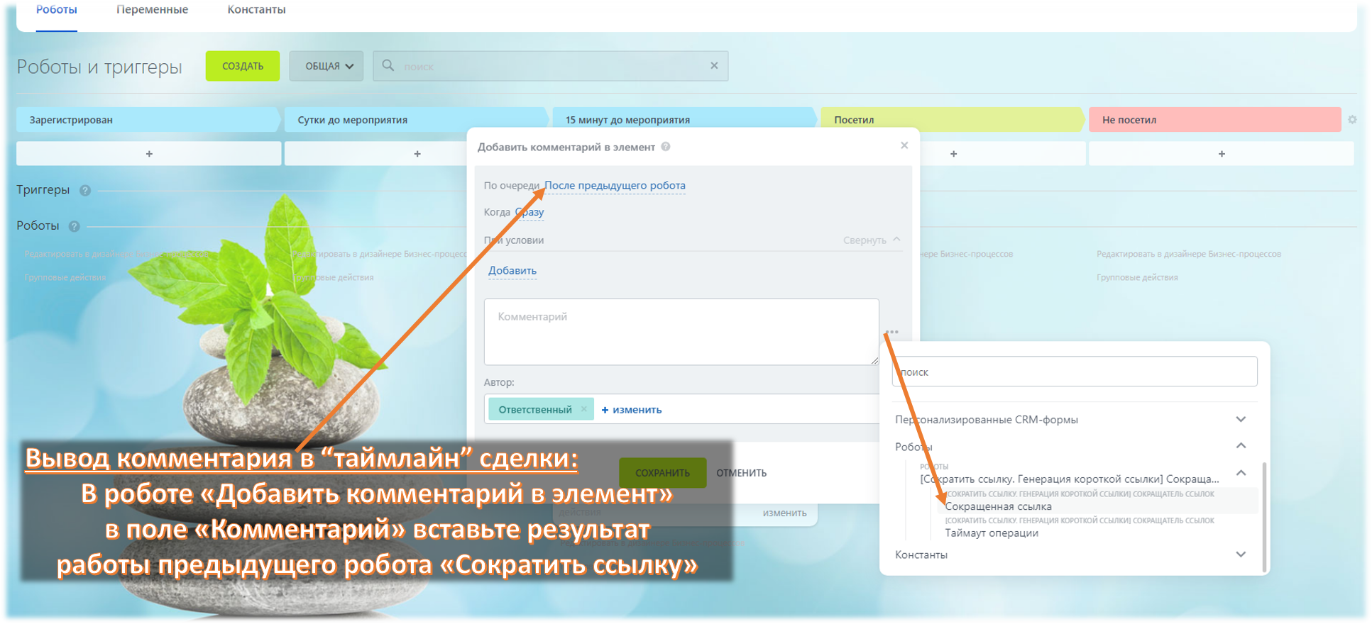 - В поле комментарий пишем нужный текст и вставляем переменную, для этого справа от поля жмем на “…”, находим раздел роботы -> "Сократить ссылку. Генерация короткой ссылки” -> Сокращенная ссылка.