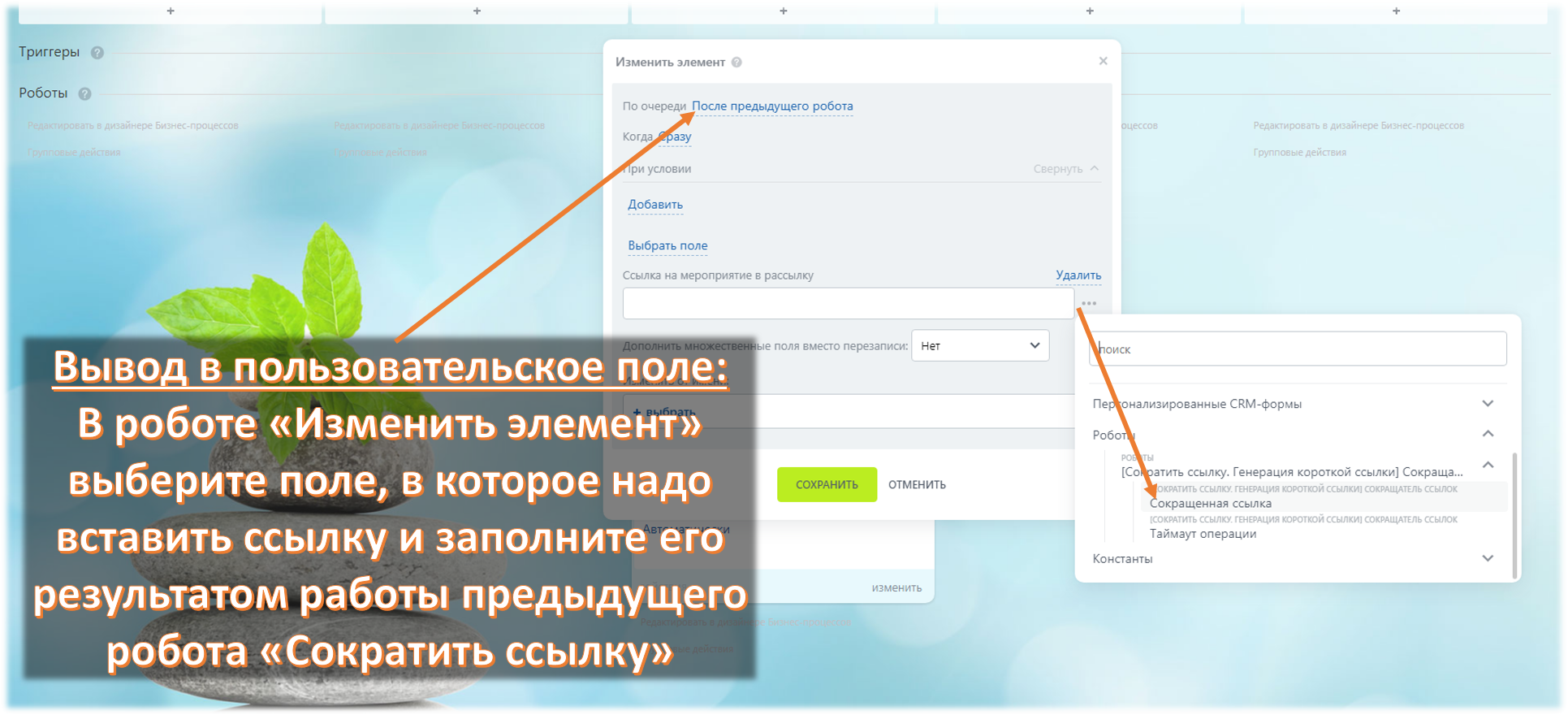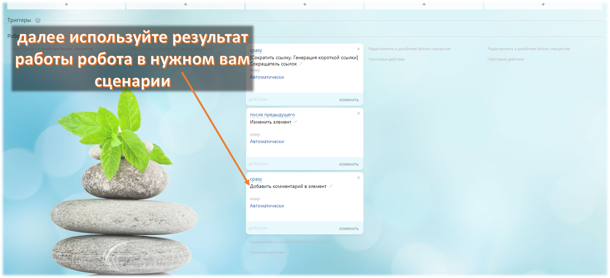- Добавляем робота "Изменение элемента" сразу после “Сокращателя ссылок” на той же стадии (настройках ставим галочку "использовать сразу после предыдущего робота")