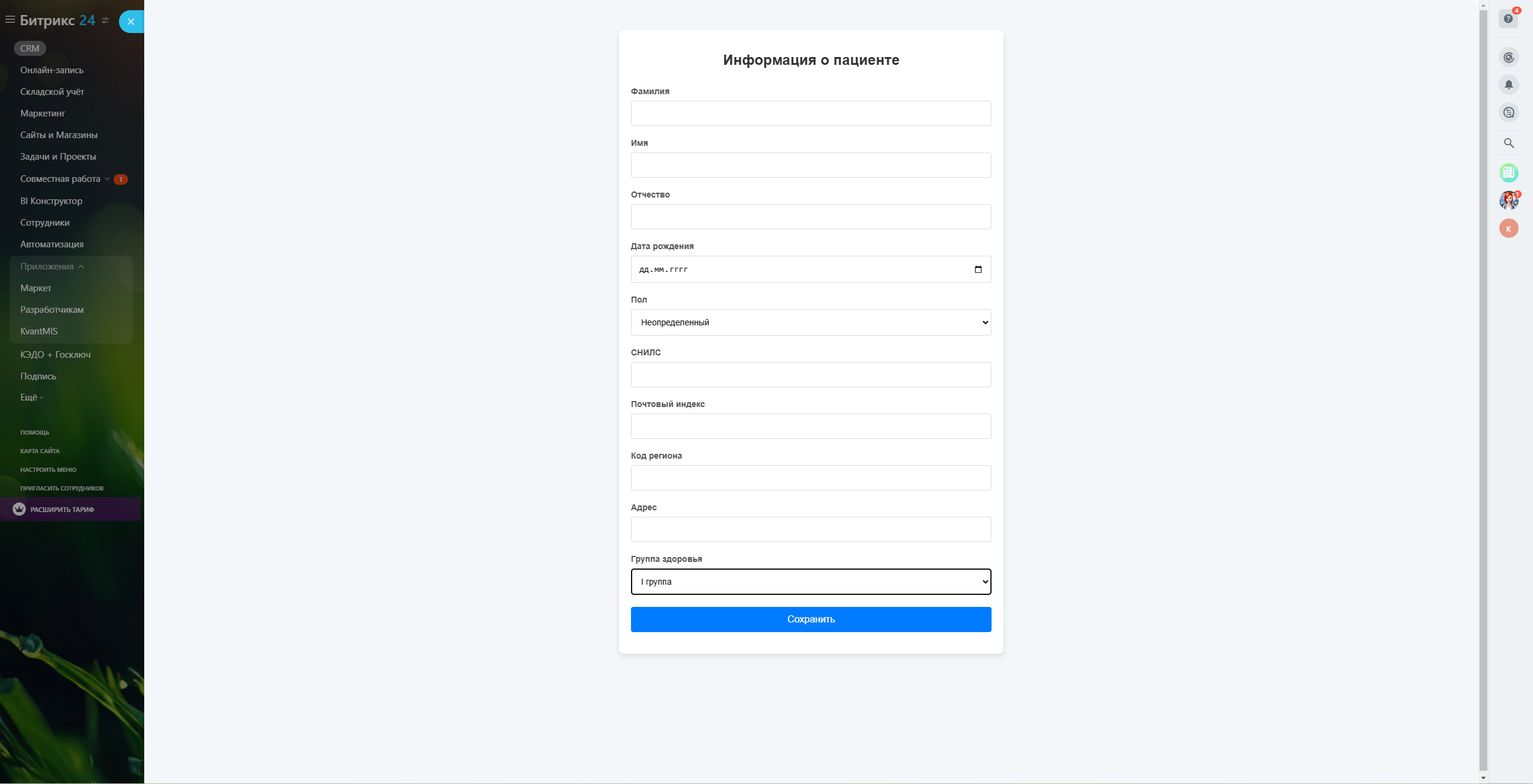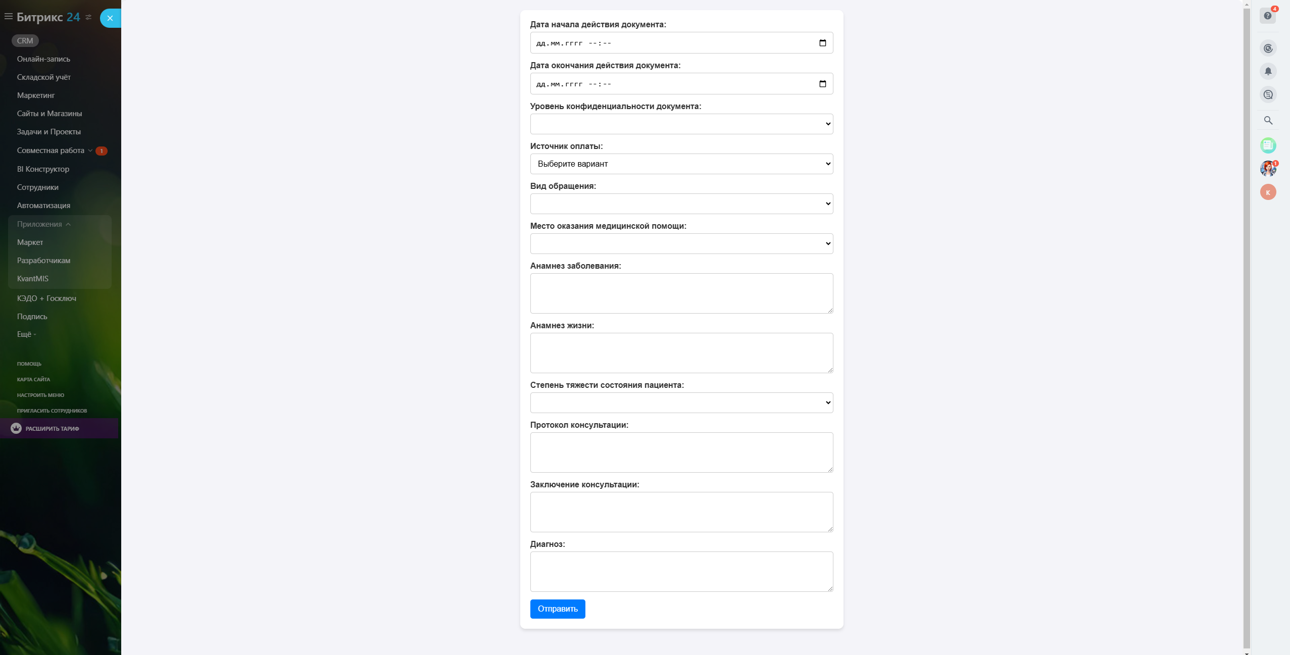 Приложение позволяет отправлять медицинские заключения в единую государственную информационную систему в сфере здравоохранения (ЕГИСЗ) через интеграцию Битрикс24 с Квант.МИС Лайт.