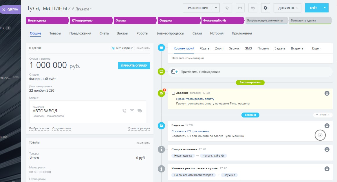 При движении Сделки по этапам автоматически выставляются задания.