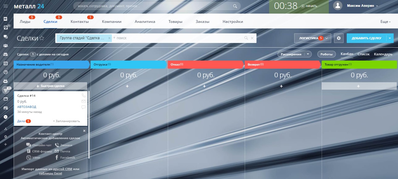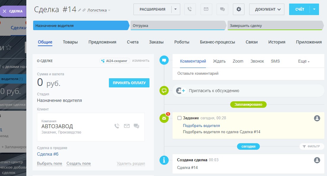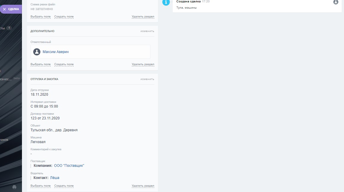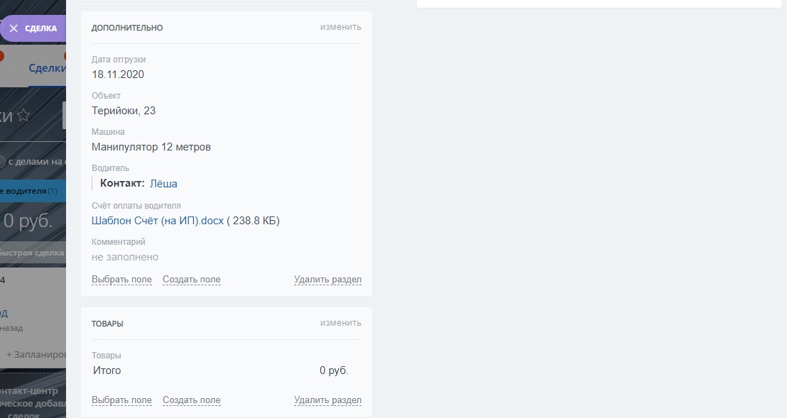 Для Сделок в направлении логистика созданы пользовательские поля в карточке и настроены максимально подходящие стадии ведения клиента: