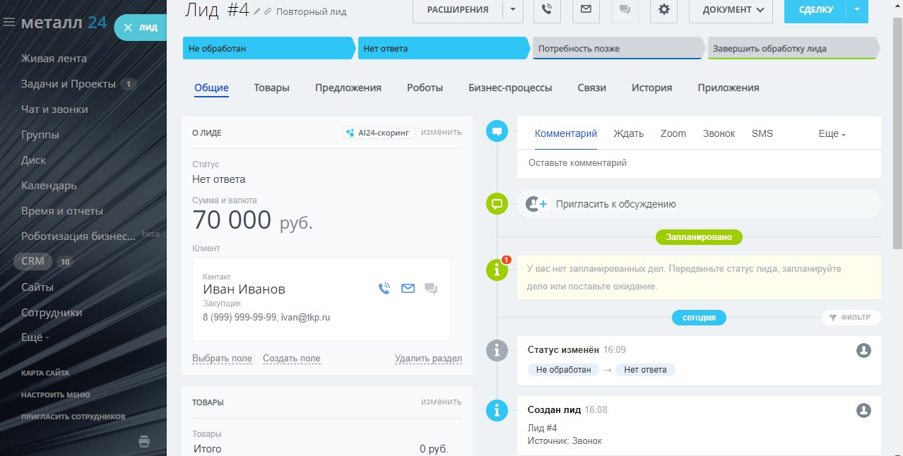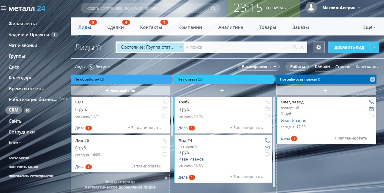 Для Лидов составлена простая карточка с необходимым набором полей и короткая воронка продаж, идеально подходит для работы с новыми заявками.