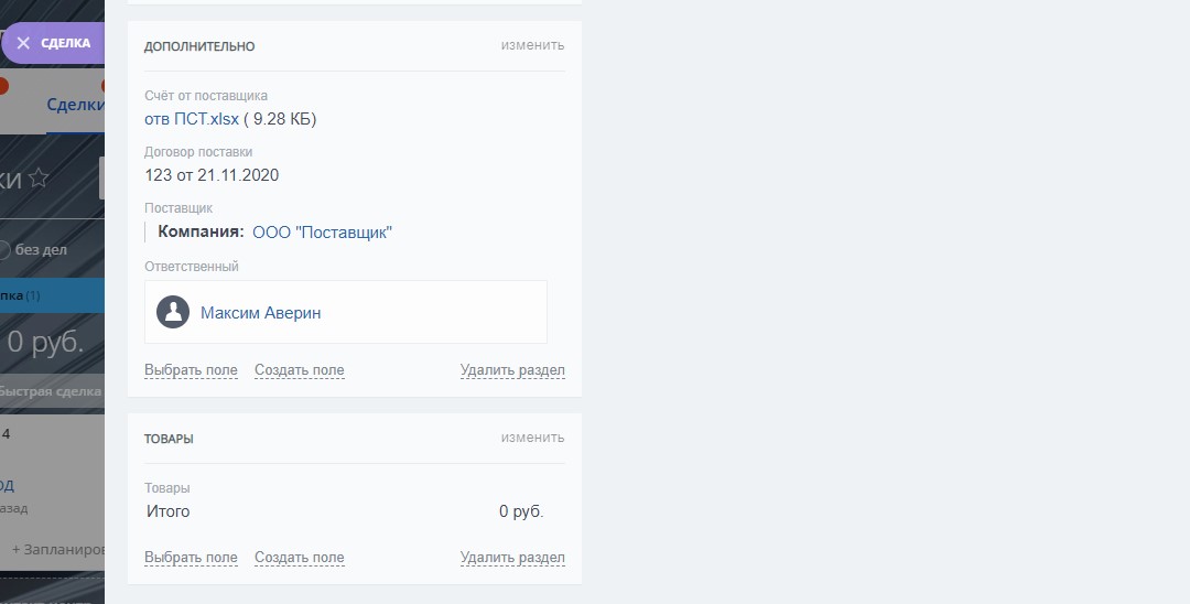 В карточке сделки по направлению "ЗАКУПКА" добавлены пользовательские поля: